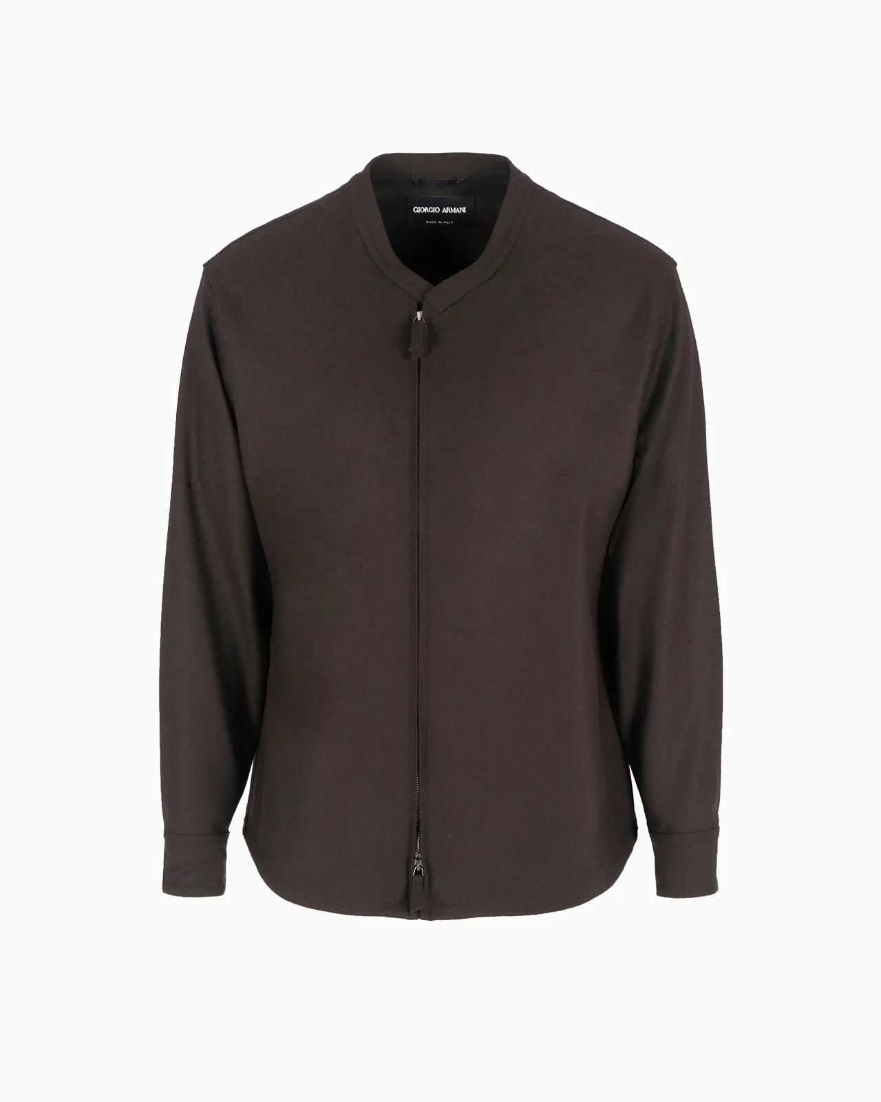 A distinctive shirt-jacket with a modern, versatile allure, made of luxuriously soft cashmere drap. The style is distinguished by its linear design, featuring a front zip closure, guru collar and buttoned cuffs. A versatile and transformative piece, perfect for wearing under the collection’s jackets or over the jumpers, always creating different looks. Product Code: GM000594TE101151U8130 Details Composition 96% Cashmere 4% Elastane Guru collar Double-slider zip closure Buttoned shirt cuffs Back yoke Unlined Length: 74 cm Made in Italy