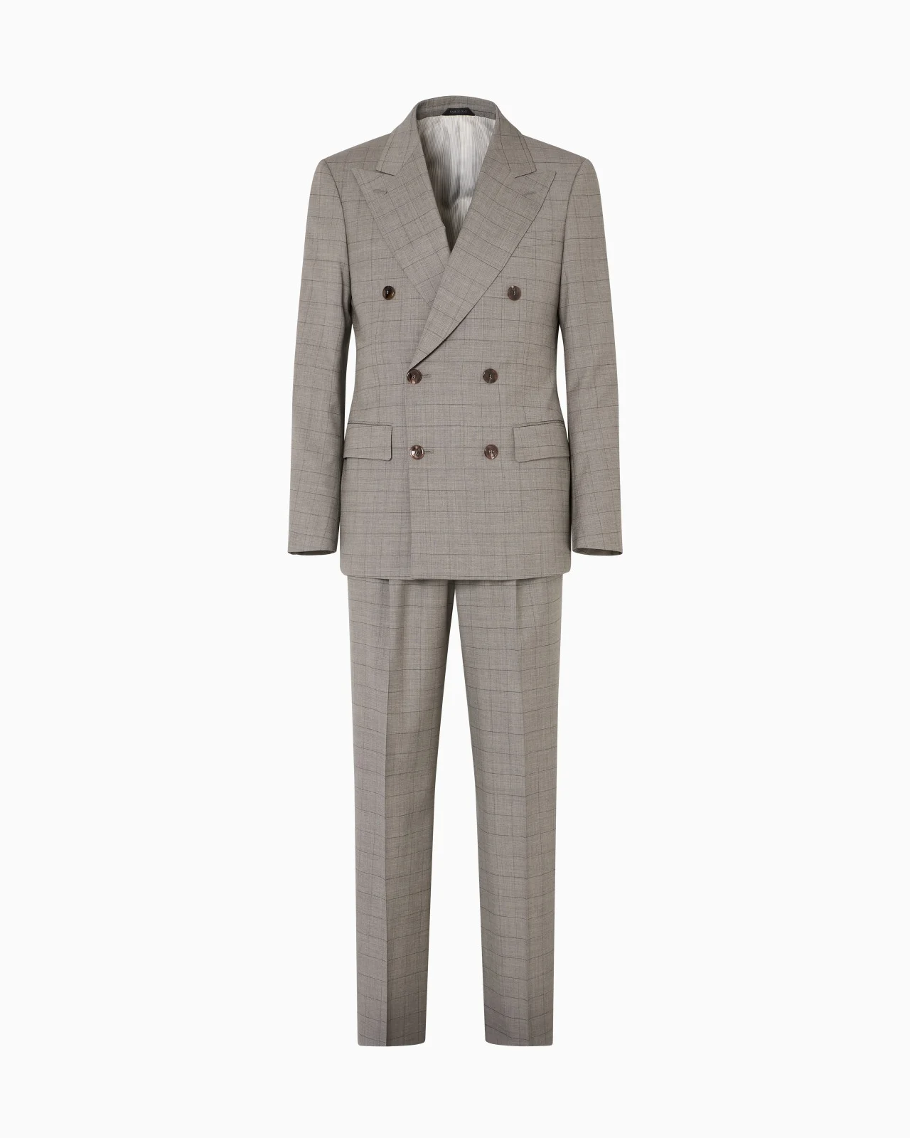 A new regular-fit style that reinterprets the brand’s iconic designs with a more modern twist. A piece that reinvents the hallmark style of the classic men’s suit in virgin wool energised by a windowpane check motif that is still modern. The style features a six-button double-breasted jacket with peak lapels and shoulders structured with a sleeve-head roll and relaxed-fit trousers with two pleats and stitched turn-ups. Royal Line suit Double-breasted jacket with six-button closure Sleeve-head reinforced with roll Peak lapels Two flap pockets Breast pocket Back side vents Length: 75 cm Trousers with zip-and-button closure Two side welt pockets Two flap and button pockets on the back Cuff width: 26.5 cm Made in Italy Product Code: GM000561TE14613M8059
