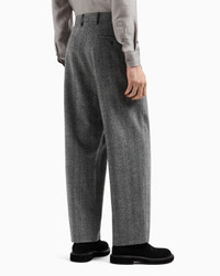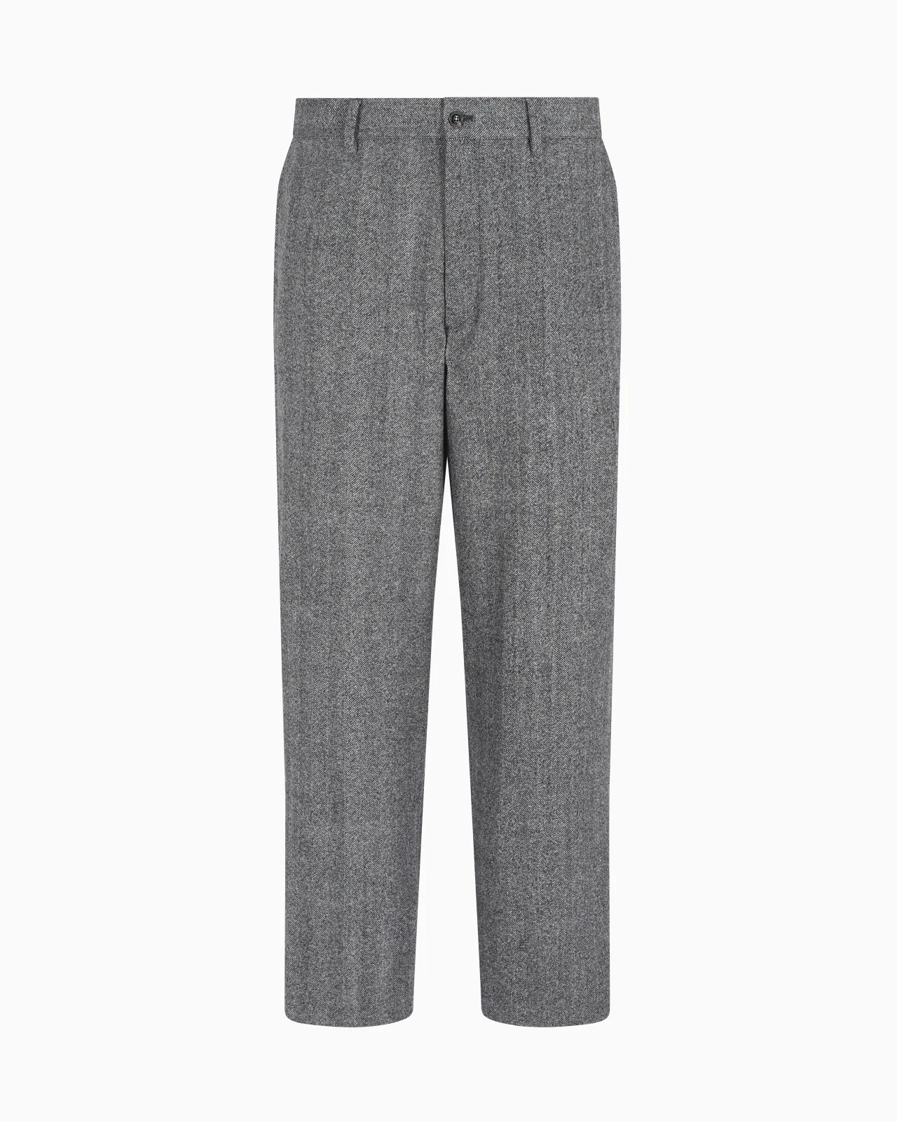 Flat-front trousers with essential, clean lines, made from pure virgin wool and featuring a two-tone chevron jacquard motif. The style is fastened with a button and zip, and has two slanted pockets and two welt pockets on the back. An extremely versatile piece, the ideal complement to numerous looks with a relaxed and effortless style. Flat-front trousers Waistband with belt loops Button and zip closure Two zipped side pockets Two buttoned back welt pockets Cuff width: 24 cm Made in Italy Product Code: GM001661TE15474M8048