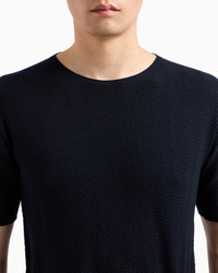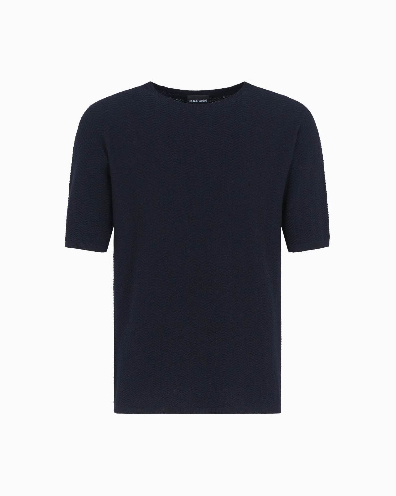 Elegant short-sleeved crew-neck jumper made from cosy virgin wool. The style features a chevron weave that creates a three-dimensional effect. Available in versatile shades that recall the collection’s colour palette, it is perfect to wear under a jacket to complete sophisticated looks. Slim fit Crew neck Short sleeves Jacquard chevron weave Made in Italy Product Code: GM000981AF14552UB102