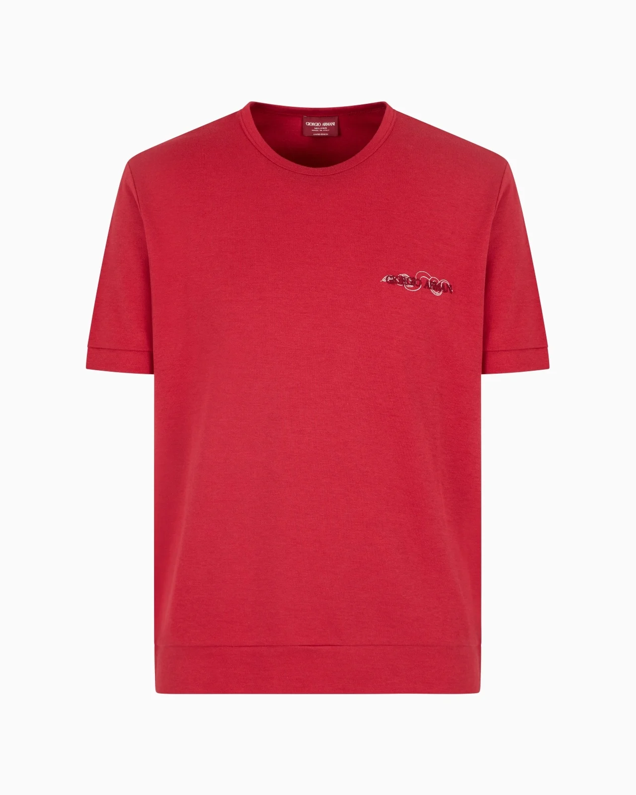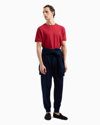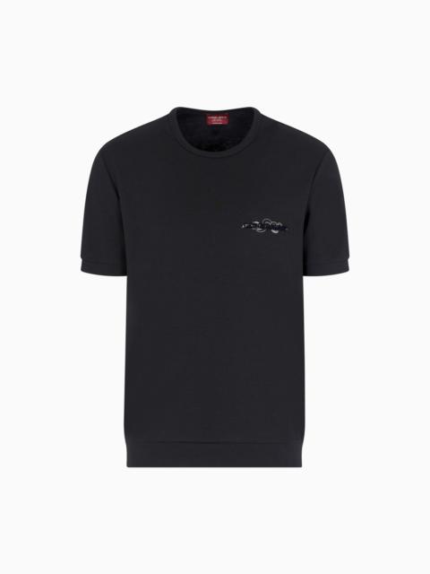 Oversized-fit, crew-neck T-shirt made of cosy cotton and silk. The style is embellished with Giorgio Armani logo embroidery, reinterpreted with the iconic symbology of the event. The style is part of the Chinese New Year selection, a collection celebrating the Year of the Snake. Clothing with an athletic allure in a deep navy blue where the snake theme plays a starring role as an embroidery framing the GA logo, customising T-shirts and accessories. Matching chenille accents add light to the styles, embellishing trousers and sweatshirts. Crew neck Short sleeves GIORGIO ARMANI logo with contrasting embroidered snake detail Made in Italy Product Code: GM001295TE14230U5078