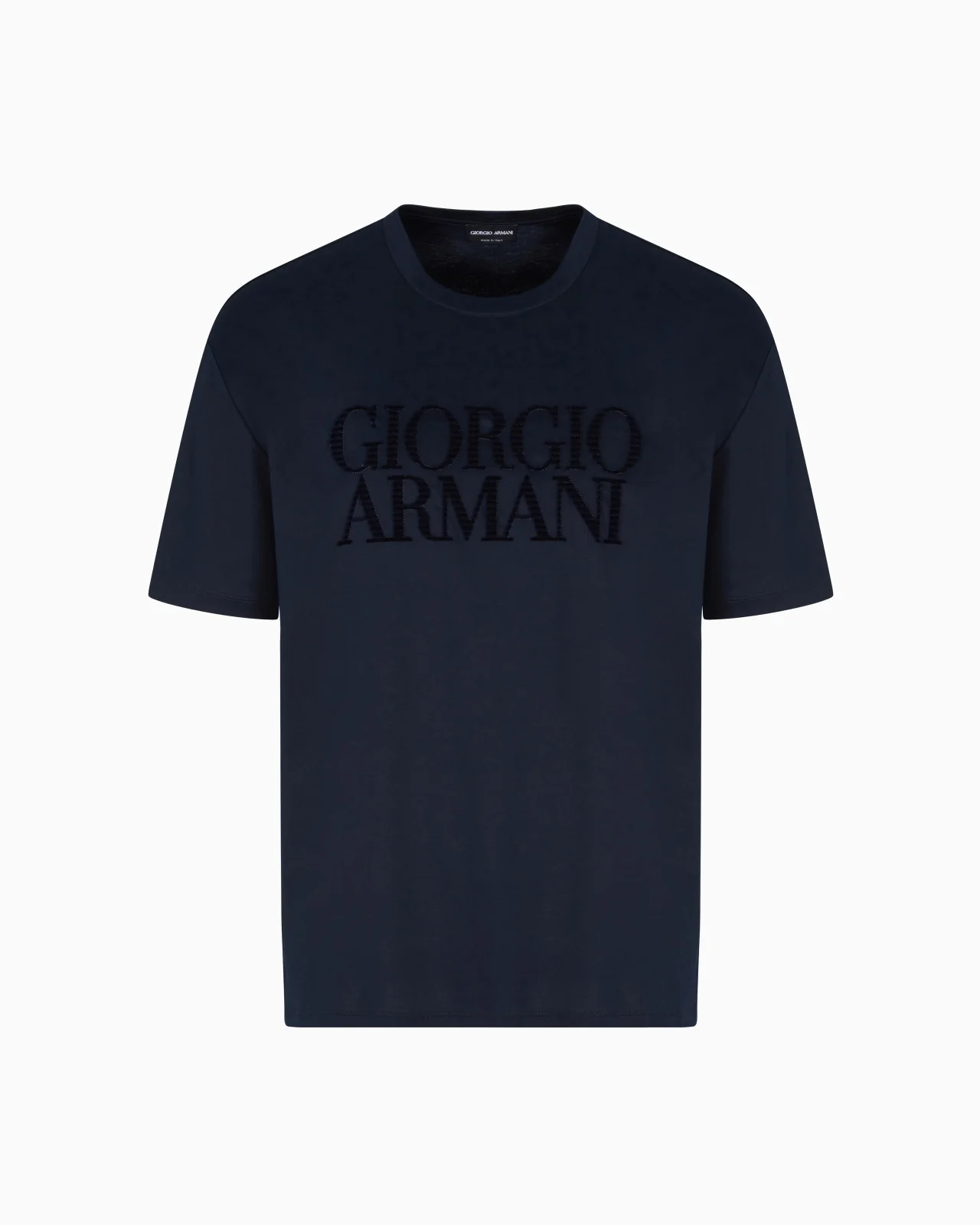 Crew-neck T-shirt made from cotton interlock, a fabric that feels fluid and cosy. Featuring an embroidered, flocked GIORGIO ARMANI logo on the chest, this style is perfect for completing relaxed looks, designed to wear on informal occasions. Crew neck Short sleeves Embroidered, flocked GIORGIO ARMANI logo on the front Made in Italy Product Code: GM001971TE10629UB100