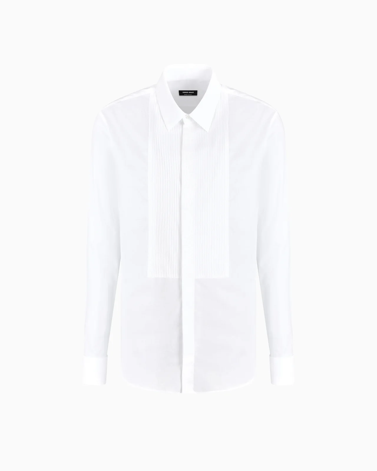 This slim-fit shirt is made from luxury cotton twill. Its unique, large, front faced placket evokes a tuxedo shirt plastron. A style that perfectly completes elegant evening looks. Slim fit French collar with collar stays Fastened with mother-of-pearl buttons Pleated bib Back yoke Back darts French seams Double cuffs Made in Italy Product Code: GM000477TE10820M0018