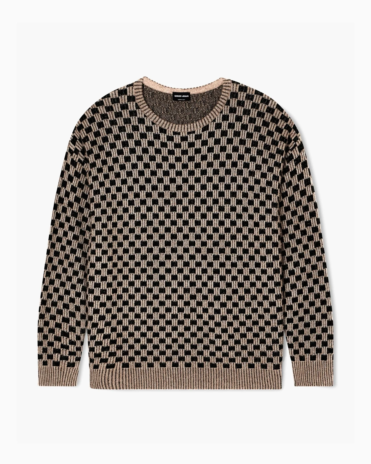A sophisticated jacquard embellishes the smooth, comfortable lines of this crew-neck jumper, which is crafted from a blend of cashmere and silk. Defined by ribbed trims and enlivened by a two-tone check motif, the style lends itself to relaxed looks, perfect for leisure time and casual events. Fineness: 12 Crew neck Long sleeves Check two-tone jacquard Ribbed hem, cuffs and collar Made in Italy Product Code: GM002184AF20317FC006