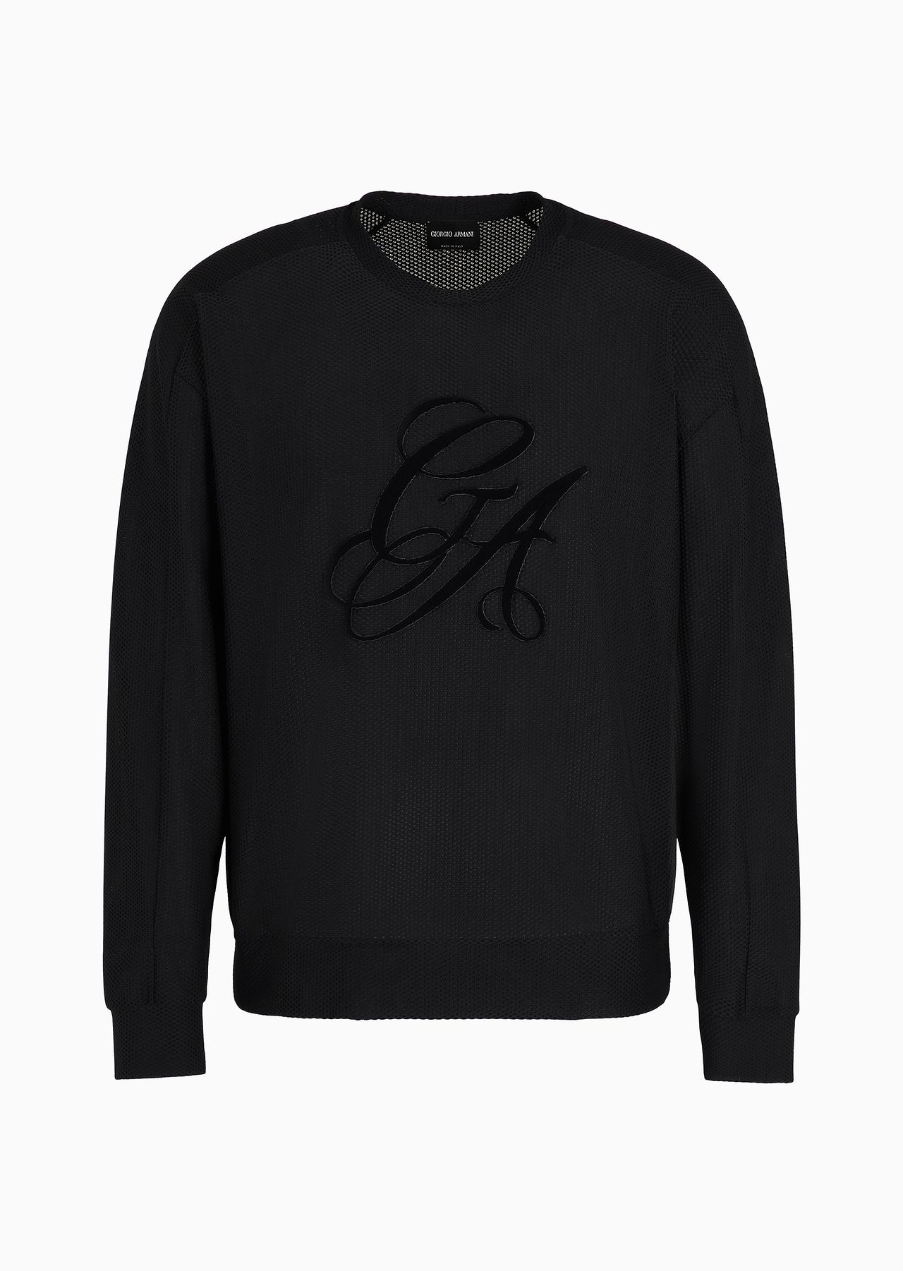 Relaxed-fit, crew-neck sweatshirt made from a technical waffle fabric that feels extremely comfortable. The streetwear-inspired style is embellished with a front embroidery of the monochromatic GA monogram in italics in a flocked finish. A garment that perfectly complements off-duty looks with effortless style. Product Code: GM000228TE100451UC001 Details Composition 80% Polyamide 20% Elastane Oversized fit Crew neck Long sleeves Oversized GA logo with a flocked finish Made in Italy Fitting The model is 188 cm tall and is wearing size 48 / M