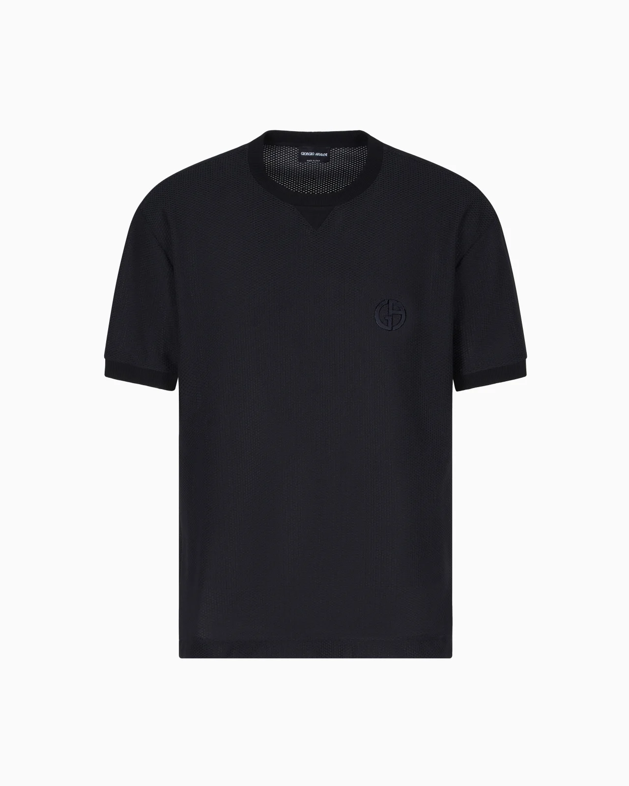 Relaxed-fit, crew-neck T-shirt made from technical waffle fabric with a distinctive three-dimensional texture, embellished with matching knit details. An offering that reinterprets a piece from the world of sportswear with an Armani twist, customised by the matching chenille GA logo. Crew neck Short sleeves Matching chenille GA logo Matching knit details on the neckline and down the sleeves Made in Italy Product Code: GM001979TE10045UC001