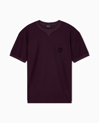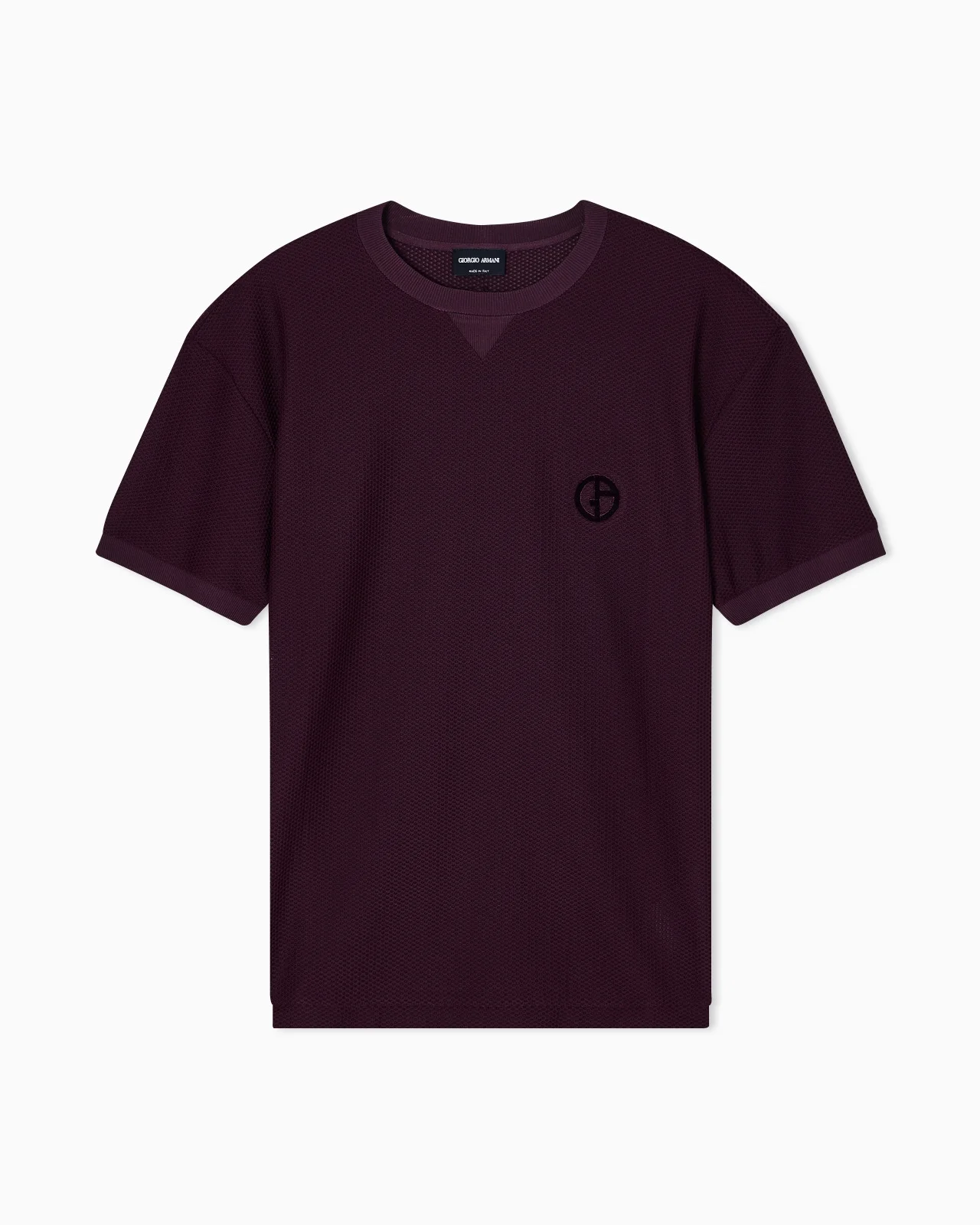 Relaxed-fit, crew-neck T-shirt made from technical waffle fabric with a distinctive three-dimensional texture, embellished with matching knit details. An offering that reinterprets a piece from the world of sportswear with an Armani twist, customised by the matching chenille GA logo. Crew neck Short sleeves Matching chenille GA logo Matching knit details on the neckline and down the sleeves Made in Italy Product Code: GM001979TE10045U5079