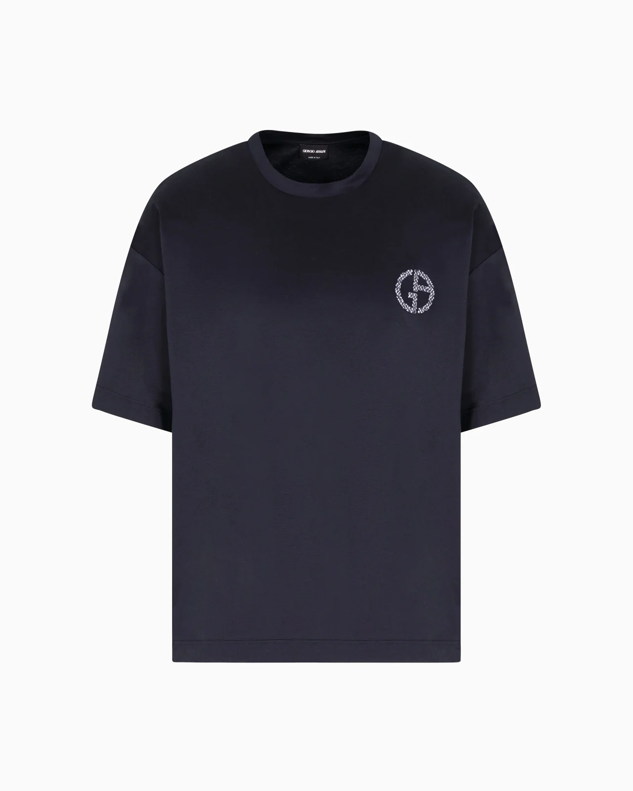 Oversized, crew-neck T-shirt made from cosy, comfortable cotton interlock. The style is customised with a two-tone GA logo embroidered on the chest. The piece is part of the Denim collection, a selection with a modern fit, made of premium fabrics embellished with exclusive details and workmanship. An athletic yet sophisticated look that reworks classic denims according to the brand’s stylistic codes. Crew neck Short sleeves Two-tone GA logo embroidered on the chest Made in Italy Product Code: GM000315AF20835UB100