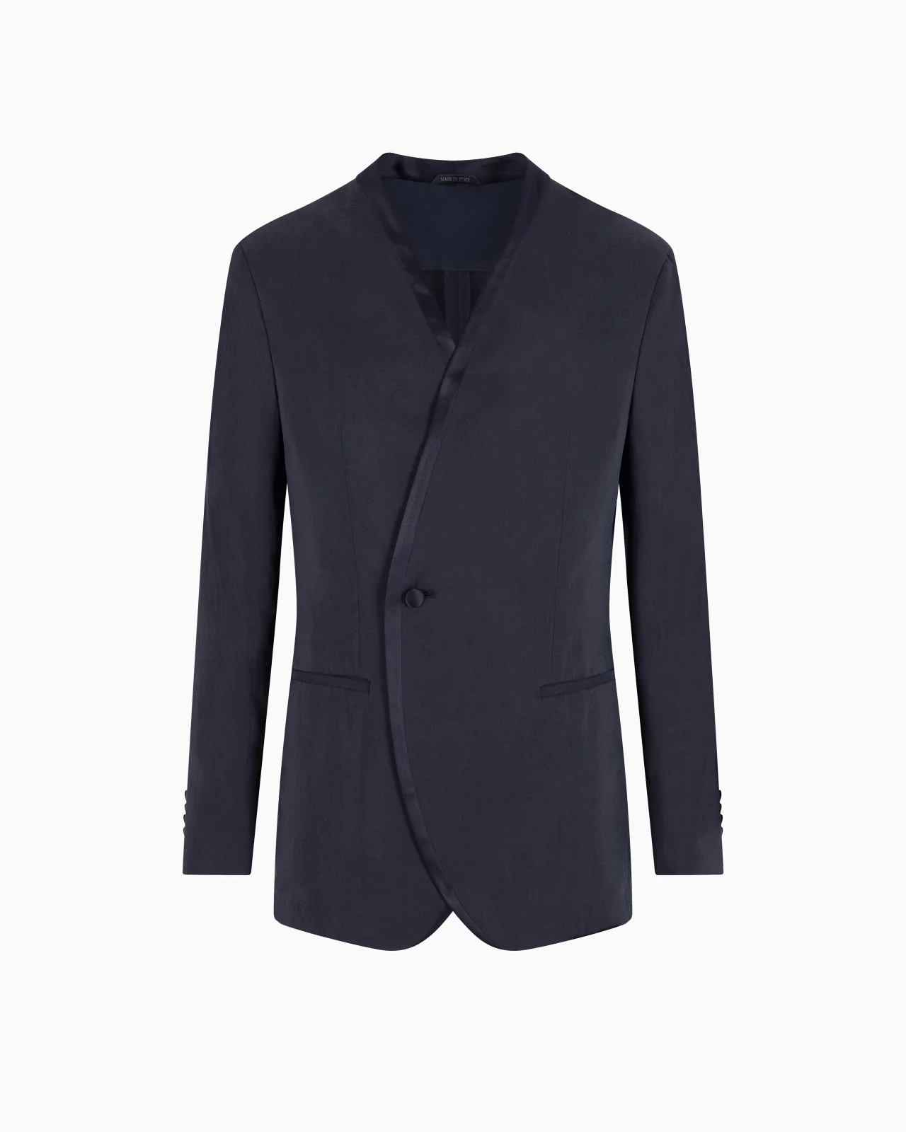 Sophisticated tuxedo jacket made from a silk blend, featuring a distinctive slightly asymmetrical one-button fastening. Defined by a lapel-free V neckline and matching satin details, it elegantly completes evening looks when worn with tuxedo trousers and a white shirt. Single-breasted tuxedo jacket V neck Monochromatic satin profiles and details Single-breasted closure with one covered button Two small welt pockets Buttoned cuffs Unlined Length: 75 cm Made in Italy Product Code: GM001565TE10081U8134