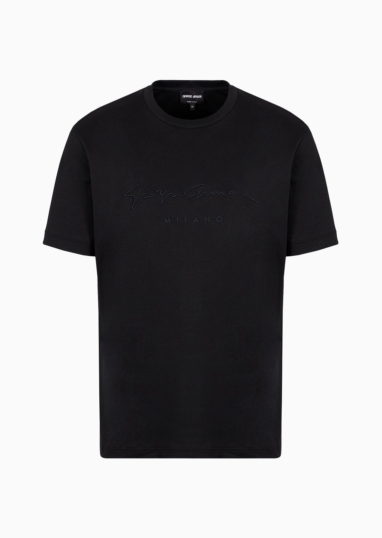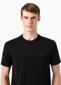 This pure cotton jersey T-shirt features a Giorgio Armani signature in embossed cordonnet embroidery on the front. Short sleeves and a round neckline complete the style. Product Code: 6GSM90SJRQZ1UC99 Details Composition 100% Cotton Crew neck Short sleeves Monochromatic signature logo embroidered on the chest Made in Italy Fitting The model is 6' and is wearing size 48 (IT)