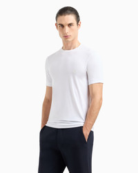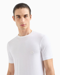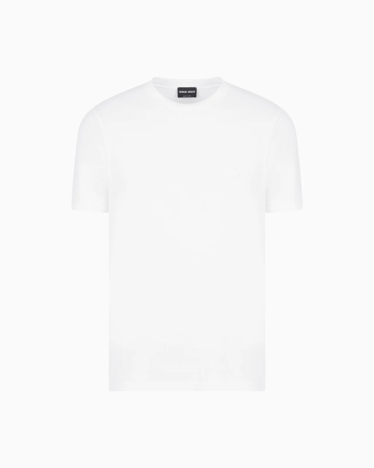 An evergreen, essential garment, symbolic of Giorgio Armani’s simple elegance. A T-shirt made of stretch viscose jersey with a crew neck, monochromatic GA logo embroidered on the chest and collar with turned back and lapped trims. Slim fit Crew neck Short sleeves Monochromatic embroidered logo Stretch bamboo-viscose jersey Made in Italy Product Code: 3GST52SJP4ZU090