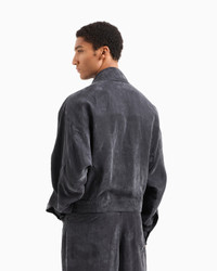 Blouson made of Lyocell canvas, a semi-synthetic fibre that is produced from eucalyptus trees and has an exceptionally low impact on the environment. It is valued for its excellent durability, capacity to absorb moisture, breathability and crease resistance. Embellished with a faded effect, the item features a shirt collar, asymmetrical fastening with a concealed zip and buttons and elastic at the hem, details that accentuate its versatile, modern spirit. <br>The piece is part of the Holiday selection that plays with a striking colour palette, incorporating black onyx, sky blue and ivory. These shades are combined with luxurious fabrics like linen and silk, and iconic ones, like cupro and Lyocell, creating a unique experience in texture. Modern, relaxed shapes dress up different occasions with unmistakable Giorgio Armani style. Shirt collar Asymmetrical closure with concealed zip and two buttons Two slanted press-stud pockets Single-buttoned cuffs Elasticated hem Unlined Length: 62 cm Made in Italy Product Code: GM001746TE16002UC001