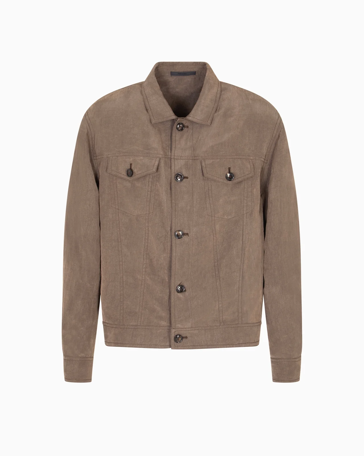 Blouson made of Lyocell canvas, a semi-synthetic fibre that is produced from eucalyptus trees and has an exceptionally low impact on the environment. It is valued for its excellent durability, capacity to absorb moisture, breathability and crease resistance. Embellished with a faded effect, it features a shirt collar, exposed button closure and flap patch pockets, details that highlight its versatile, modern spirit. <br>The piece is part of the Holiday selection that plays with a striking colour palette, incorporating black onyx, sky blue and ivory. These shades are combined with luxurious fabrics like linen and silk, and iconic ones, like cupro and Lyocell, creating a unique experience in texture. Modern, relaxed shapes dress up different occasions with unmistakable Giorgio Armani style. Shirt collar Exposed button closure Two patch pockets with flap and button Two snap-button side pockets Single-buttoned cuffs Unlined Length: 66 cm Made in Italy Product Code: GM001738TE16002U7001