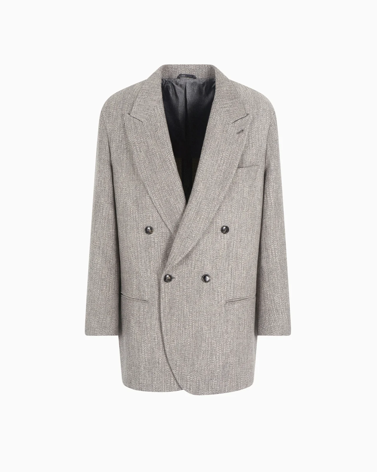 A tribute to the historic archive looks, this single-breasted jacket in a jacquard wool and viscose blend with a distinctive bark effect celebrates the Eighties aesthetic. This jacket features a completely deconstructed design and distinctive inverted A-line, with peak lapels, natural shoulders and a slightly narrower waist. A piece that enhances these statement yet extremely current volumes, allowing freedom of movement and comfort. Product Code: GM001648TE110731M8035 Details Composition 51% Viscose 28% Virgin Wool 14% Polyamide 7% Cashmere Heritage Line jacket Double-breasted, two-button closure Peak lapels Two front welt pockets Breast welt pocket Lined Length: 84 cm Made in Italy