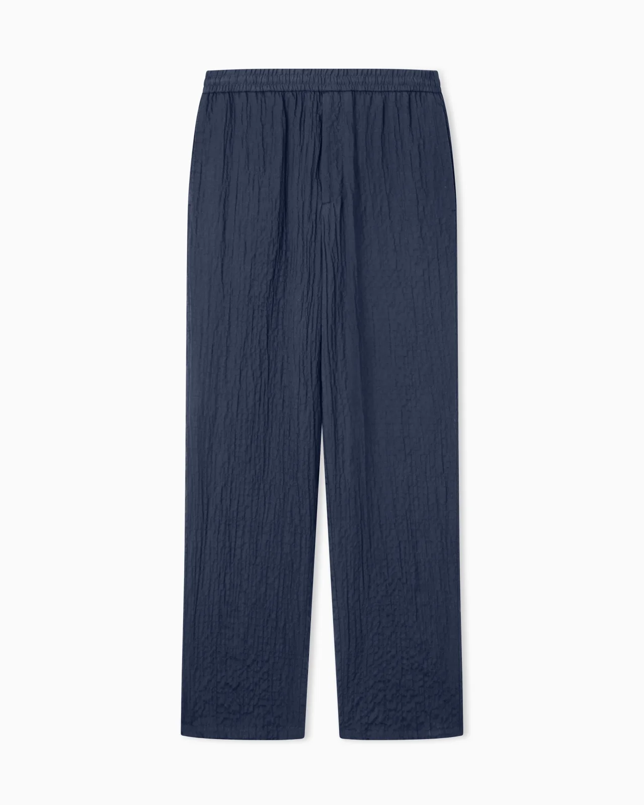 Flat-front trousers with relaxed lines, made of silk and Lyocell froisse. The style is extremely comfortable to wear thanks to the elasticated waistband. A versatile piece that perfectly completes laid-back looks. Flat-front trousers Elasticated waistband with internal drawstring Two side pockets Back pocket with button Cuff width: 22 cm Made in Italy Product Code: GM003210TE20103UB109