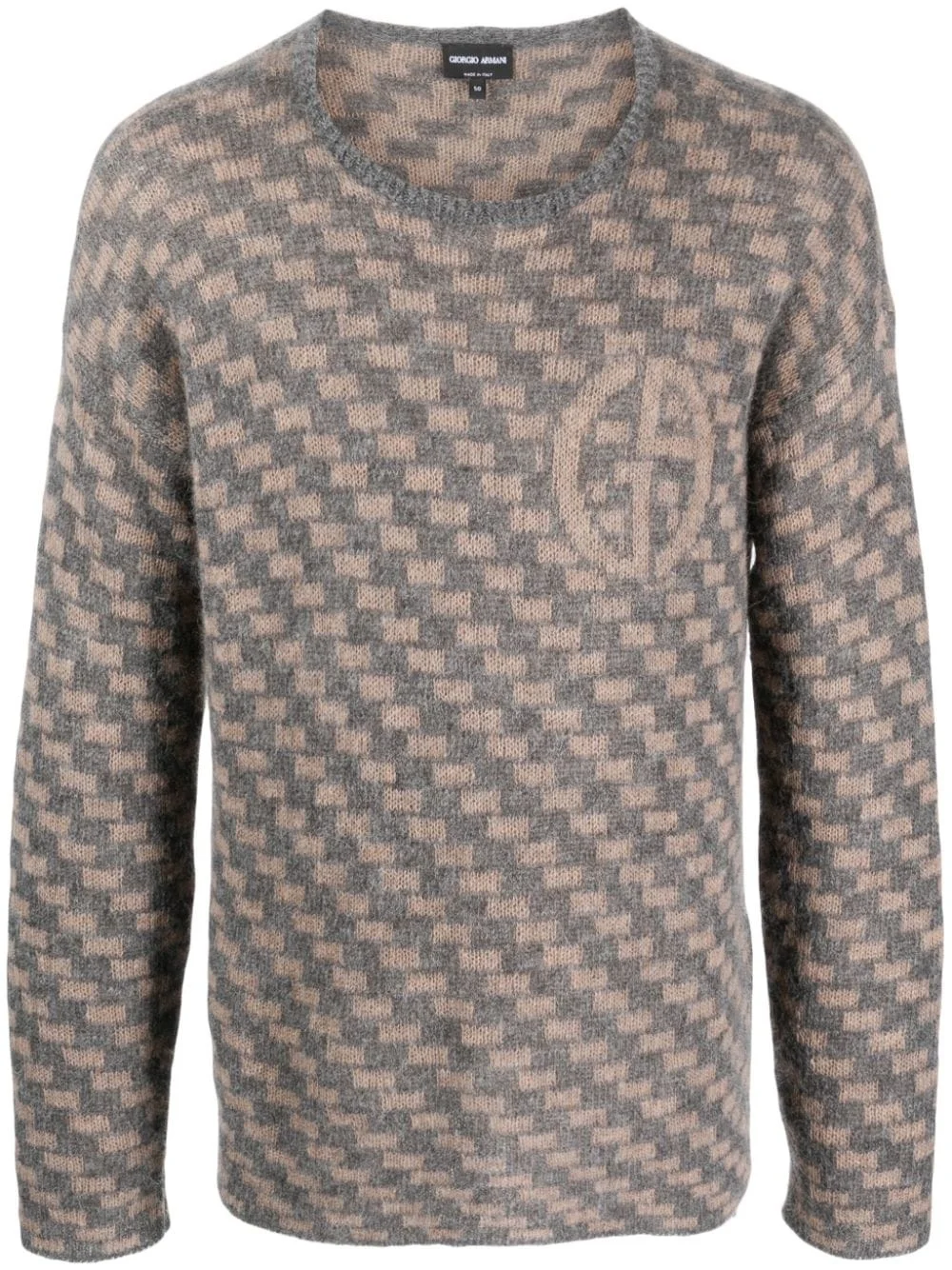 geometric-pattern intarsia-knit jumper Highlights - Medium grey - Beige - Patterned intarsia knit - Intarsia-knit logo - Crew neck - Long sleeves - Straight hem Made in Italy Composition Mohair 35%, Alpaca Wool 35%, Polyamide 30% SIZE & FIT Model measurements Height 6 ft 2 in(1.87 m) Bust/Chest 36.41 in(92.5 cm) Hips 37 in(94 cm) Waist 29.52 in(75 cm) FittingInformation Designed for a slim fit, offering a comfortable fit that sits just away from the body Made with a midweight knit, this piece offers some stretch This piece fits true to size – take your usual size