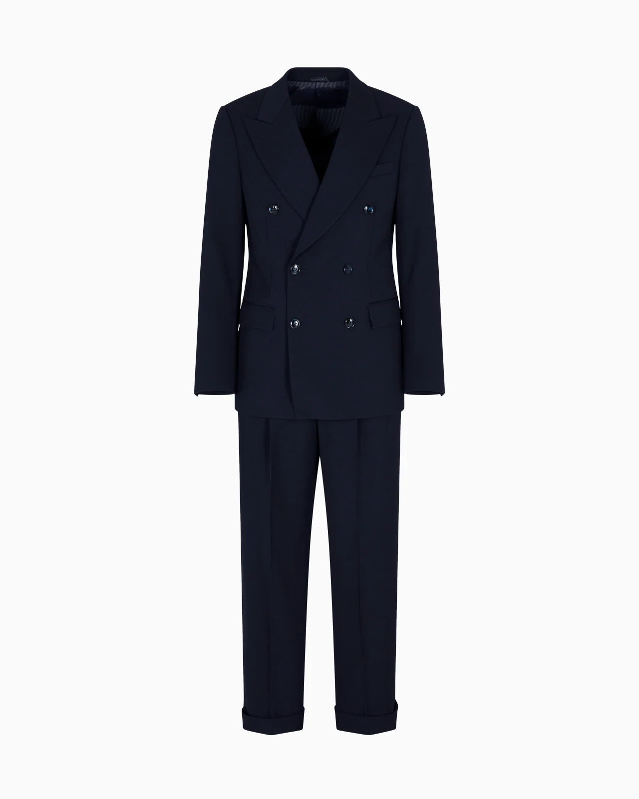 A new regular-fit style that reinterprets the brand’s iconic designs with a more modern twist. A piece that reinvents the stylistic codes of the classic men’s suit, made of wool crepe, embellished with a cannete motif. The style features a six-button double-breasted jacket with peak lapels and shoulders structured with a sleeve-head roll and trousers with two pleats and stitched turn-ups. Royal Line suit: Double-breasted jacket with six-button closure Sleeve-head reinforced with roll Peak lapels Two flap pockets Breast pocket Back side vents Length: 75 cm Trousers with two pleats and zip-and-button closure Two side welt pockets Two buttoned-flap back pockets Cuff width: 26.5 cm Made in Italy Product Code: GM002536TE17859UB109