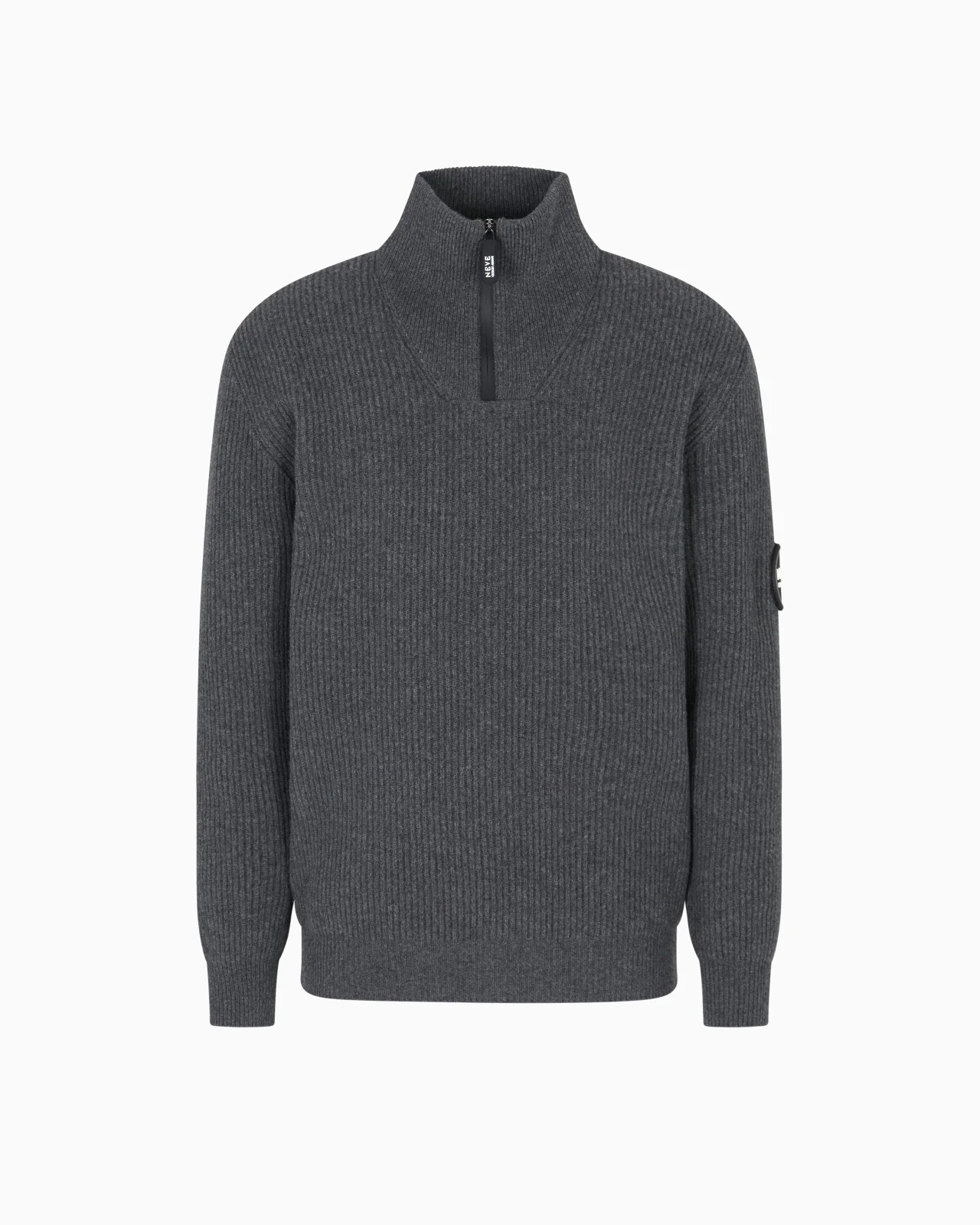 A mock-neck jumper in wool and cashmere characterised by ribbing that creates a three-dimensional effect. Warm and extremely soft, it is a garment with an athletic, refined attitude that’s perfect for wearing in the mountains for an effortless look. A special collection that combines classic elements of the brand’s highest heritage with avant-garde inspirations. Modern fits, premium materials, and innovative details and textures create a selection with a look that is both athletic and sophisticated, to enjoy winter sports in unmistakable, evergreen style. Fineness: 7 Mock neck with half zip and logo pull tab Long sleeves Removable round patch with contrasting Giorgio Armani Neve logo on the left sleeve Made in Italy Product Code: 6HSMG1SM77ZU8127