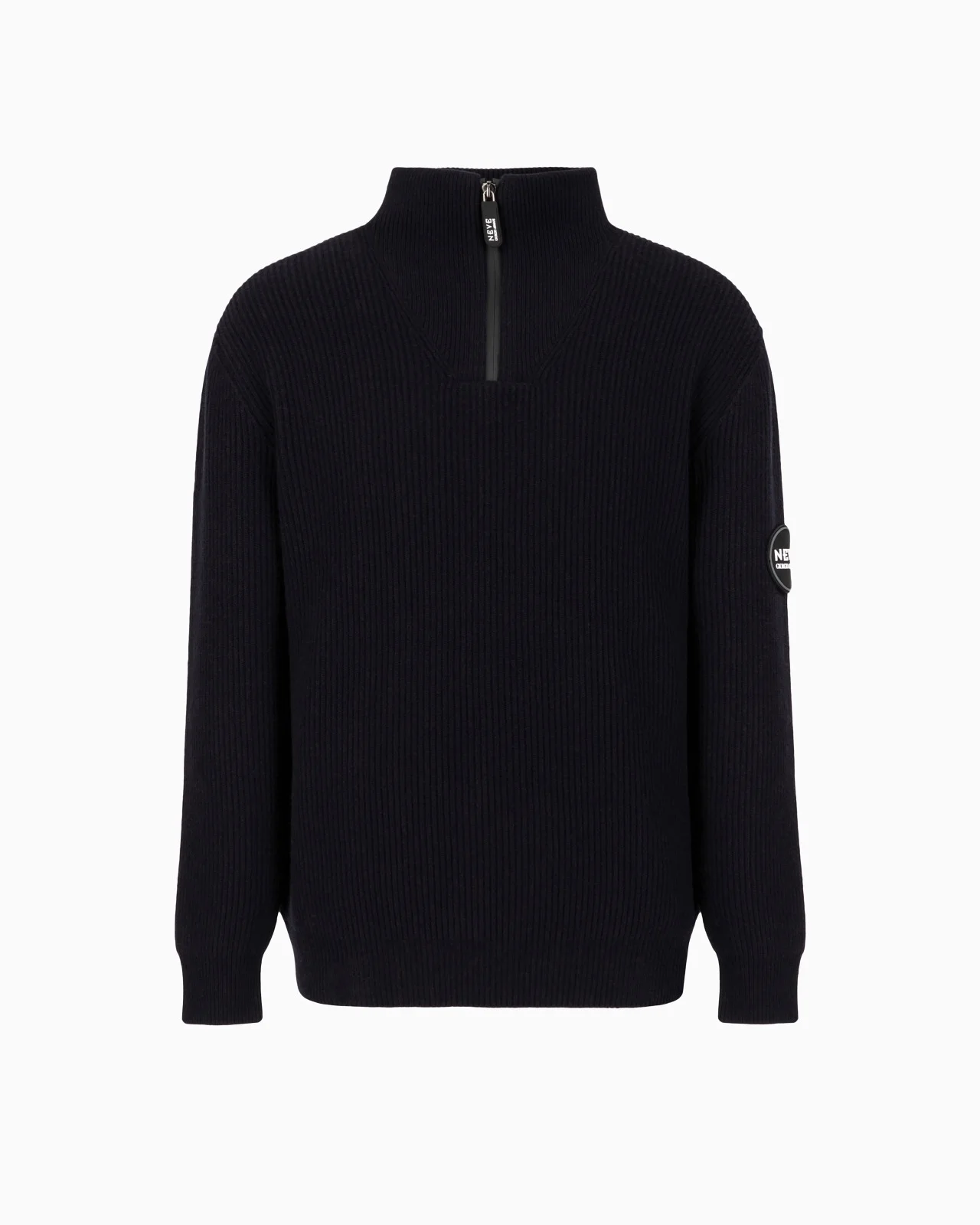 A mock-neck jumper in wool and cashmere characterised by ribbing that creates a three-dimensional effect. Warm and extremely soft, it is a garment with an athletic, refined attitude that’s perfect for wearing in the mountains for an effortless look. The garment is part of the Giorgio Armani Neve collection, a selection dedicated to the world of winter sports and mountains. An intense palette, distinguished by the iconic navy blue paired with deep chocolate brown and illuminated by the iridescent shimmer of technical canvas. The relaxed spirit and atmospheric mood of mountain resorts are interpreted in soft, warm yarns, with enveloping-volume pieces crafted with superb workmanship. Fineness: 7 Mock neck with half zip and logo pull tab Long sleeves Removable round patch with contrasting Giorgio Armani Neve logo on the left sleeve Made in Italy Product Code: 6HSMG1SM77ZUBSG