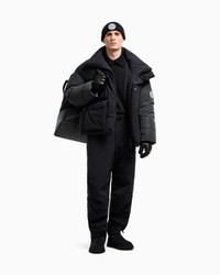 Padded ski trousers made of water-repellent iridescent fabric that protects the garment from water and snow. The item features two side pockets, two back pockets and a zip opening at the leg hem, making it easier to get boots on and off. An item designed to experience the mountains in style and comfort, ideal for teaming with other Giorgio Armani Neve creations and accessories. The garment is part of the Giorgio Armani Neve collection, a selection dedicated to the world of winter sports and mountains. A colour palette featuring intense shades of black, expertly combined with metallic-effect fabrics and froisse details, expressing textural sophistication. The spirit of the collection is evoked through cosy, warm yarns and clothing with enveloping volumes and refined workmanship. Waterproof Windproof Resistant up to 20,000 mm Elasticated waistband Zip-and-hook closure Two side welt pockets Two back pockets with concealed press studs Velcro-removable round patch with special logo Ankle hem with fastening Cuff width: 20 cm Made in Italy Product Code: GM002622AF21152UC001