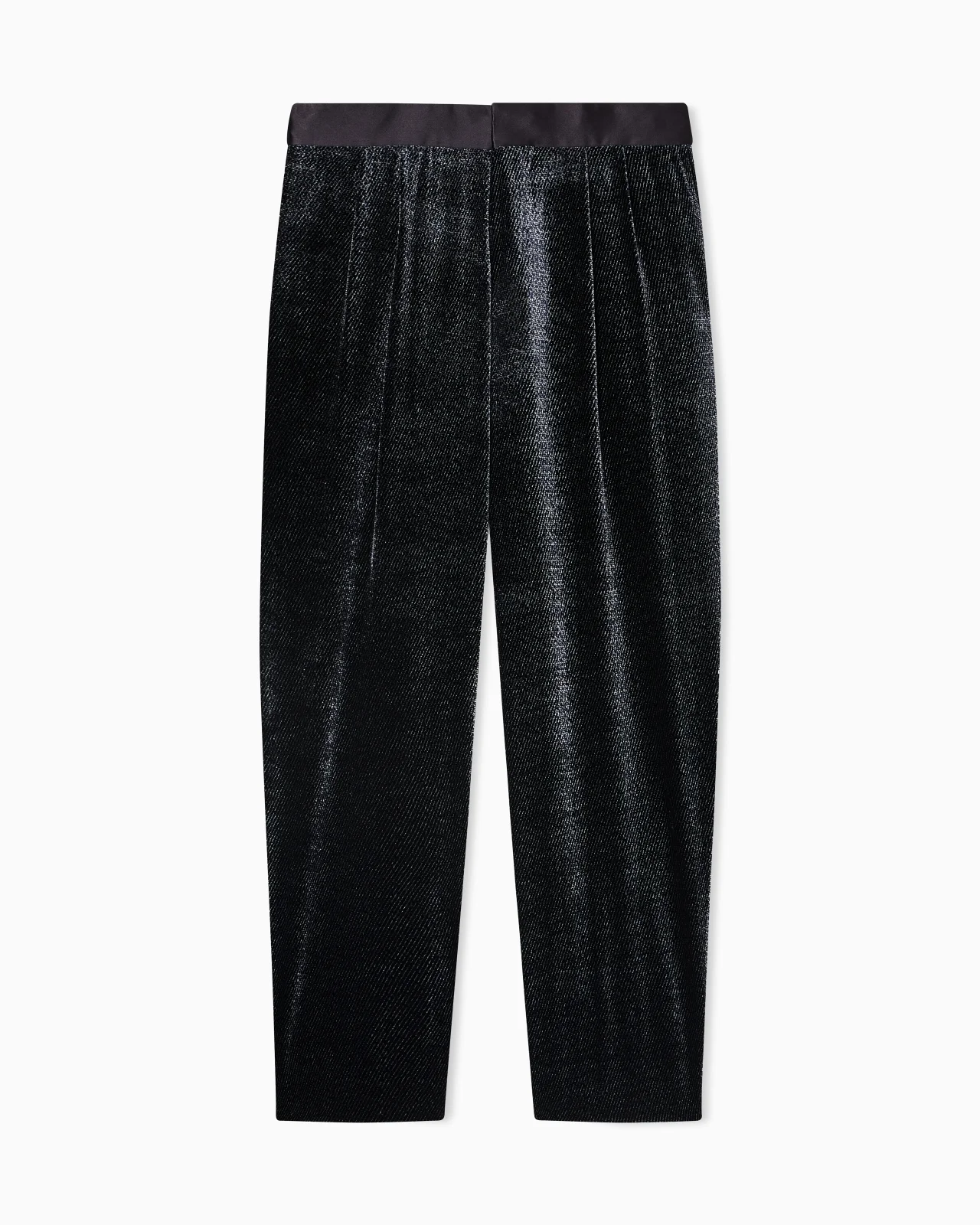 Double-pleat trousers made of exquisite devore velvet, whose refined texture catches the light with fine chiaroscuro effects, adding depth and uniqueness to the piece. An offering defined by a smooth matching satin waistband, perfect for completing looks dedicated to special occasions and formal events. This style is part of the Giorgio’s collection: the Giorgio Armani selection inspired by the evening world. Clean lines, attention to detail, an elegant night-time colour palette and the choice of luxurious materials define this modern and essential selection, providing the look for an effortless evening wardrobe. Double-pleat trousers Smooth satin waistband Zip-and-hook closure Two side pockets Two back welt-pockets with a button Cuff width: 19.5 cm Made in Italy Product Code: GM002428TE17433MB022