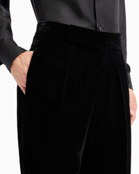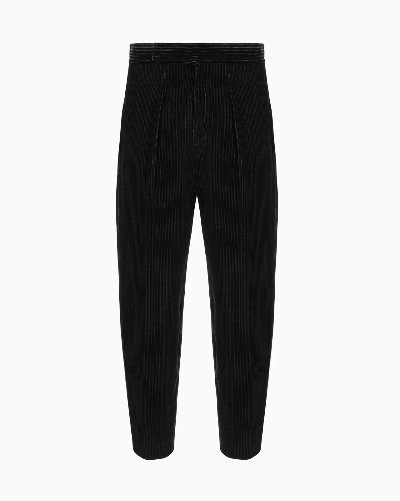 Shiny single-pleat trousers made from the collection's velvet, embellished with a shiny pinstriped motif. The style has a waistband with a concealed hook, zip fastening and side pockets, and is perfect for completing evening looks for special occasions with a sophisticated touch. This style is part of the Giorgio’s collection: the Giorgio Armani selection inspired by the evening world. Clean lines, attention to detail, an elegant night-time colour palette and the choice of luxurious materials define this modern and essential selection, providing the look for an effortless evening wardrobe. Product Code: GM000500TE117961MC023 Details Composition 70% Viscose 23% Mulberry silk 7% Polyamide Single pleat Waistband with concealed hook Concealed zip closure Two side pockets Two buttoned back pockets Cuff width: 19 cm Made in Italy Fitting The model is 188 cm tall and is wearing size 48 / M