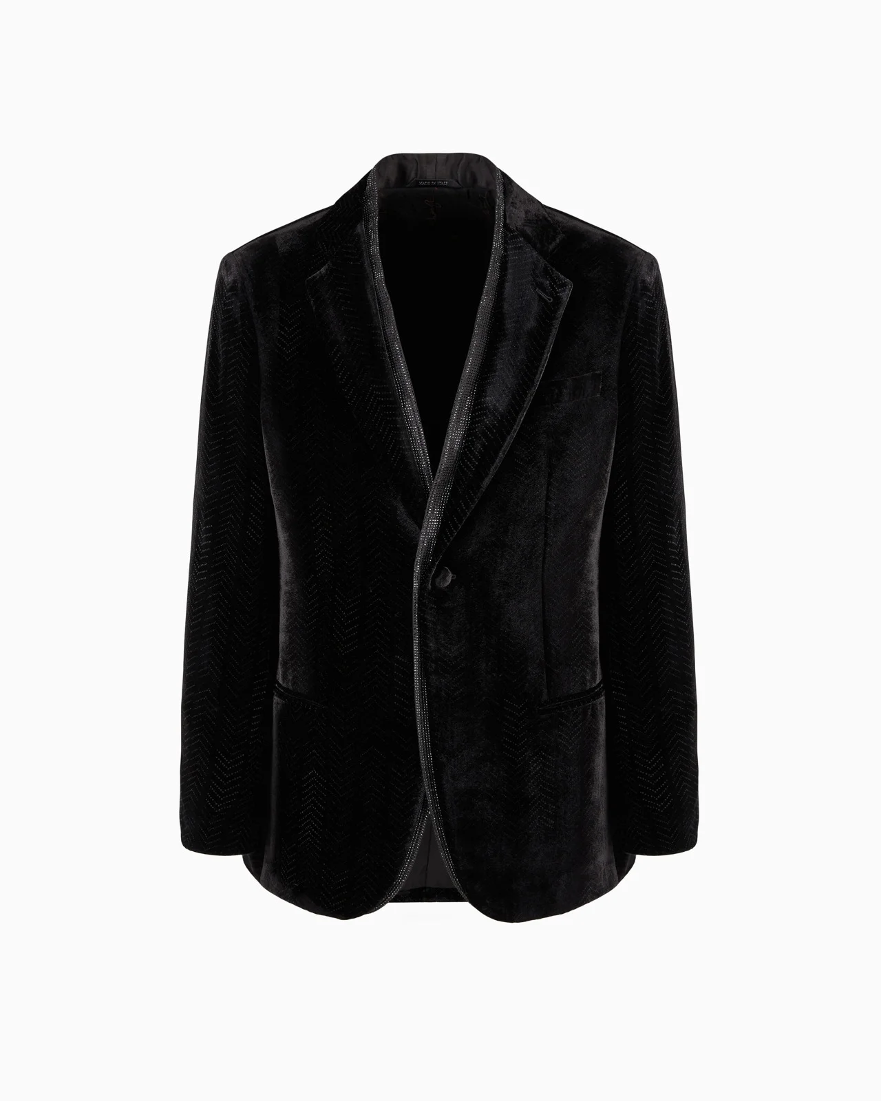 Elegant and bright single-breasted jacket made of the collection’s velvet, embellished with a monochromatic chevron motif. The style features a covered button closure, welt pockets and is lit-up by an exquisite shawl collar covered in all-over monochromatic rhinestones. Extremely refined and luxurious, this jacket is perfect for creating dramatic, special evening looks. This style is part of the Giorgio’s collection: the Giorgio Armani selection inspired by the evening world. Clean lines, attention to detail, an elegant night-time colour palette and the choice of luxurious materials define this modern and essential selection, providing the look for an effortless evening wardrobe. Product Code: GM000486TE118671MC023 Details Composition 100% Paper Single-breasted jacket Shawl lapels Single-breasted closure with two covered buttons Two welt pockets Scarf-effect insert with matching heat-adhesive pave rhinestones Breast welt pocket Covered buttons at the cuffs Silk lining with all-over signature logo Two inner pockets Length: 73 cm Made in Italy Fitting The model is 188 cm tall and is wearing size 48 / M