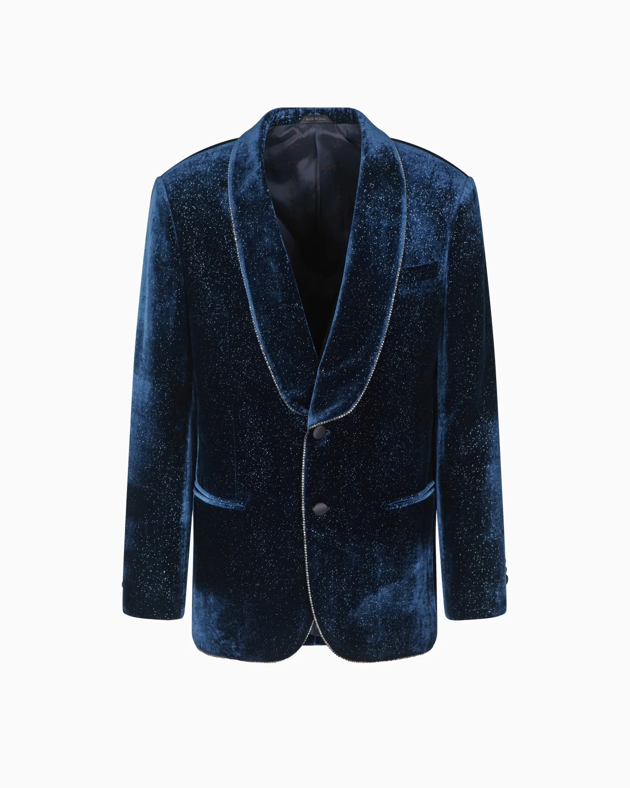 Shimmering single-breasted tuxedo jacket in velvet, made distinctive with all-over glitter. The style has a collar with shawl lapels, and is embellished with contrasting rhinestone piping, a covered button fastening and welt side pockets. A sparkling piece, perfect as the star of special occasion looks. This style is part of the Giorgio’s collection: the Giorgio Armani selection inspired by the evening world. Clean lines, attention to detail, an elegant night-time colour palette and the choice of luxurious materials define this modern and essential selection, providing the look for an effortless evening wardrobe. Single-breasted tuxedo jacket Shawl collar Buttoned, single-breasted closure Contrasting rhinestone piping Two welt pockets Breast welt pocket Buttons at the sleeve hem Lined Length: 73.5 cm Made in Italy Product Code: GM002440TE18158MB025