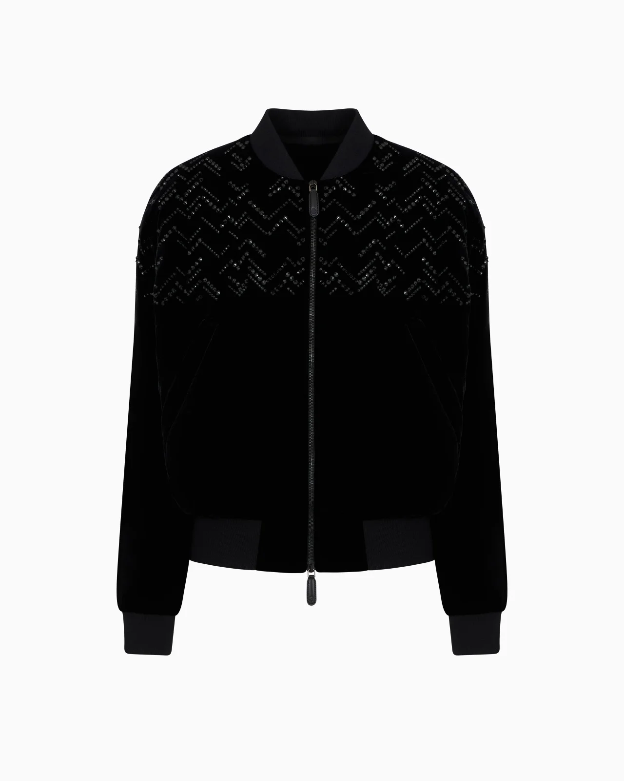 The bomber jacket, strongly associated with sportswear, is reinvented here for the evening in black velvet from the collection. Finished with matching knit edges, a zip fastening and warm lightweight padding, the style is illuminated on the shoulders and the chest with a chevron motif made of black heat-adhesive rhinestones. A sophisticated piece, perfect for special occasion looks. This style is part of the Giorgio’s collection: the Giorgio Armani selection inspired by the evening world. Clean lines, attention to detail, an elegant night-time colour palette and the choice of luxurious materials define this modern and essential selection, providing the look for an effortless evening wardrobe. Product Code: GM000529TE100461UC001 Details Composition 66% Viscose 32% Cupro 2% Elastane Regular fit Cashmere knit baseball collar Zip closure Two snap-button side pockets Monochromatic rhinestone appliques on the top part Lightweight padding Silk lining with contrasting all-over signature logo print Two buttoned inner pockets Length: 64 cm Made in Italy Fitting The model is 188 cm tall and is wearing size 48 / M