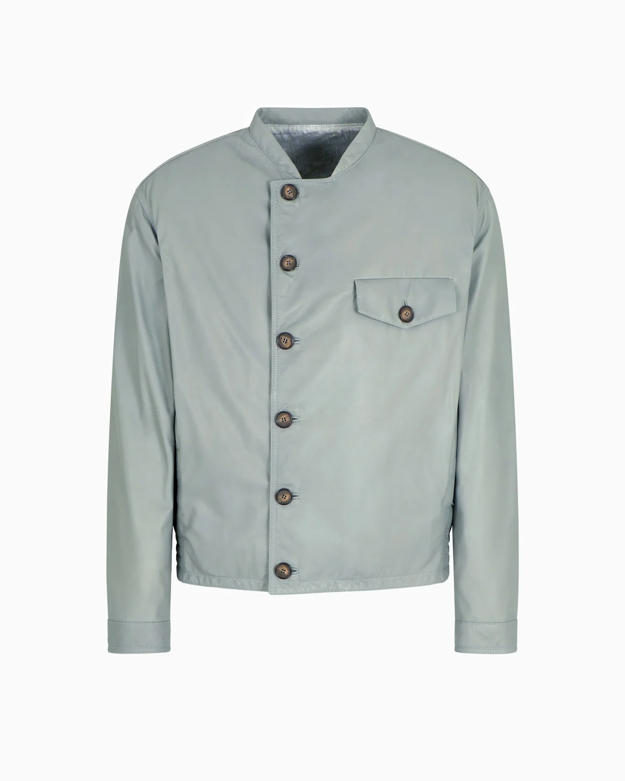 Retro-inspired blouson made of supple, luxurious glove-quality lambskin nappa leather, available in the collection’s hallmark shades. With warm, lightweight padding and fully lined in linen, the style has a distinctive matte finish, created by the hammering of the leather followed by spraying. It features a small baseball collar, a slightly asymmetric button placket, a flap breast pocket and side pockets. An exquisite, refined item, ideal to complement many seasonal looks. Lightly padded Baseball-shirt collar Asymmetrical six-button closure One breast pocket with flap and button Two zipped side pockets Buttoned shirt cuffs Stretch detail at the back hem Linen lining Inner pocket Length: 65 cm Made in Italy Product Code: GM001379AF15283U8066