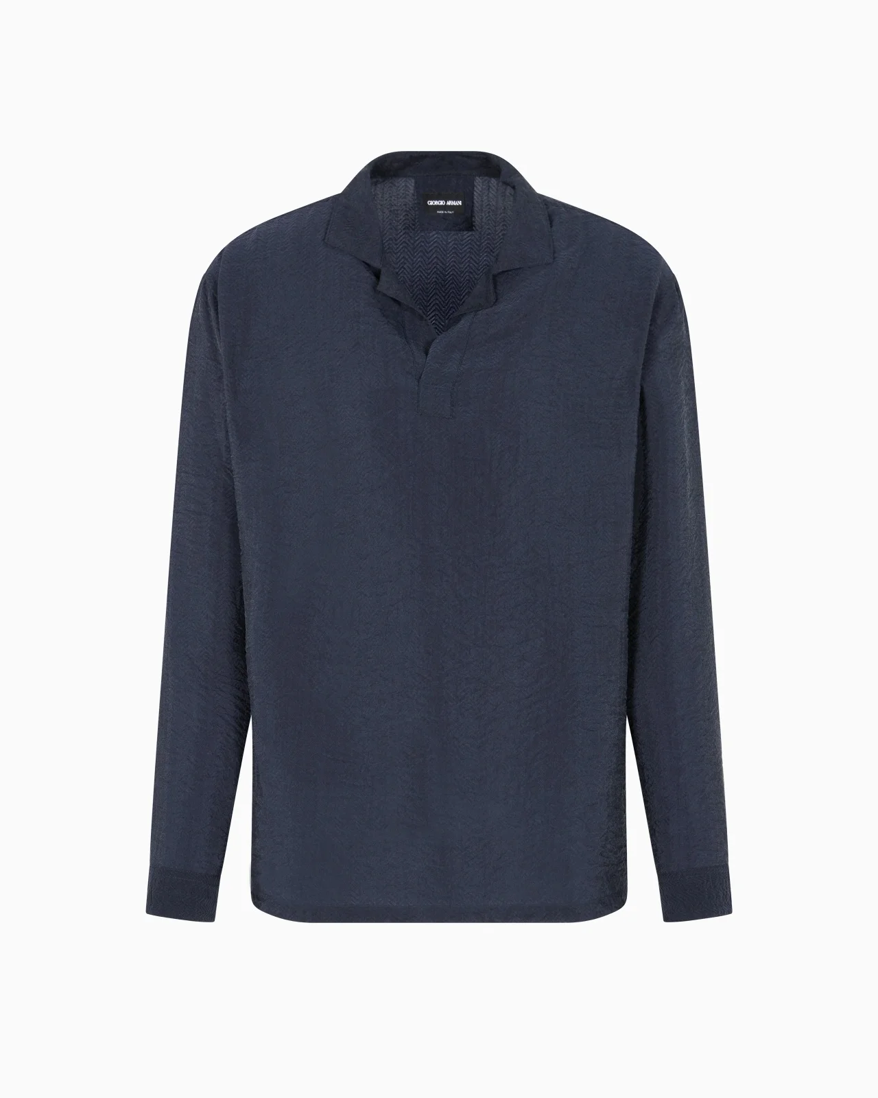 Shirt made of cupro, a special natural-origin fibre that is subsequently enzyme-treated. It is selected for its distinctive fluid, almost liquid appearance, a prominent feature of the brand’s clothing. With an open polo shirt collar, buttoned cuffs and side slits, this style is made distinctive by the chevron jacquard, which further accentuates its silky finish. A versatile offering designed for day-to-night use. <br>The piece is part of the Holiday selection that plays with a striking colour palette, incorporating black onyx, sky blue and ivory. Such shades are combined with luxurious fabrics like linen and silk, and iconic ones, like cupro and Lyocell, creating a unique experience in texture. Modern, relaxed shapes dress up different occasions with unmistakable Giorgio Armani style. Open polo-shirt collar Long sleeves Button cuffs Side slits Made in Italy Product Code: GM000316TE16001UB100