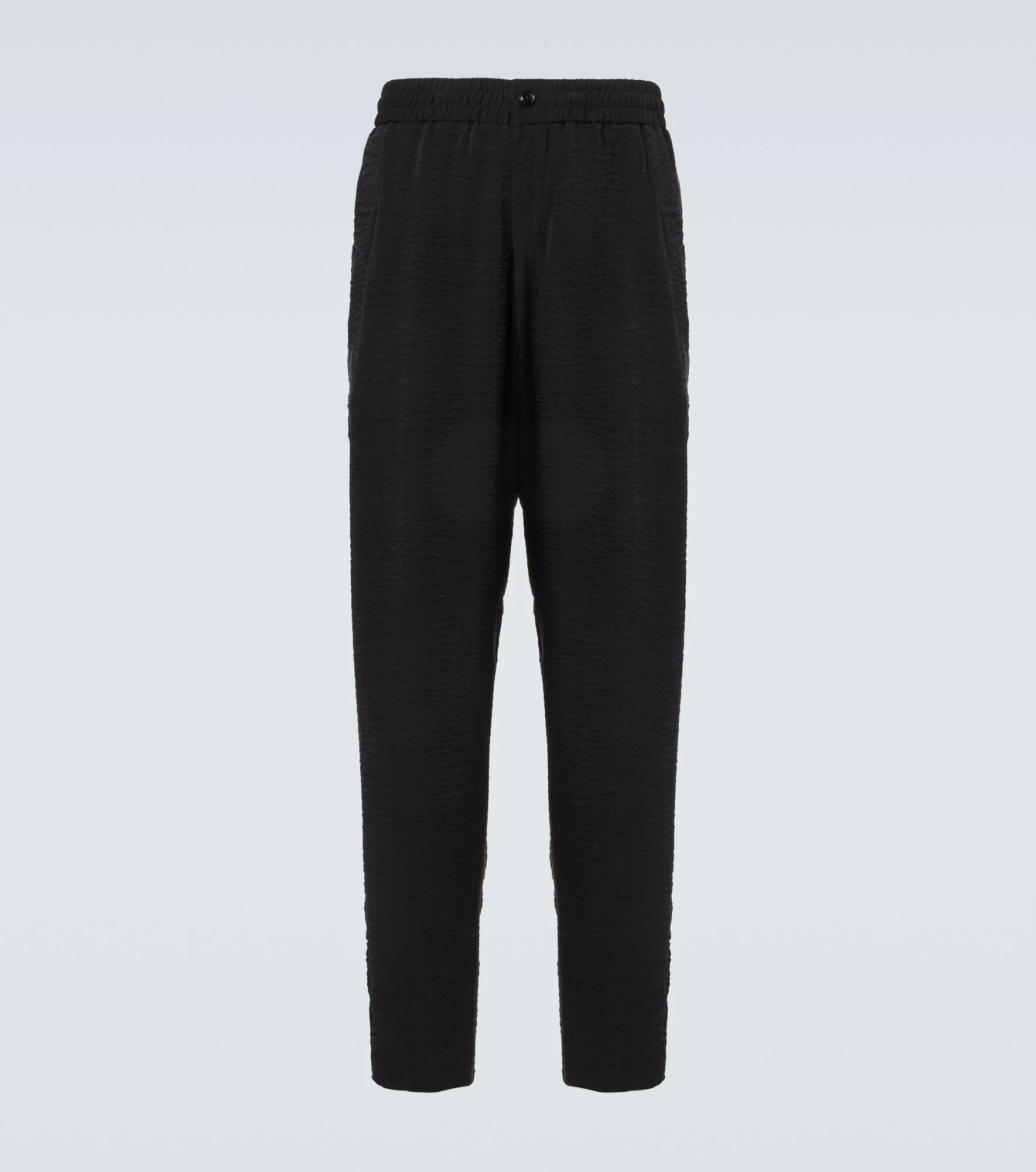 Known for its streamlined modernity, Giorgio Armani presents an elegant take on classic silhouettes and immaculate suiting. Crafted in Italy using jacquard, these straight pants feature side pockets and drawstrings at the waist. Product Details - Material: 74% cupro, 26% polyamide - Care instructions: dry clean - Made in Italy - Designer color name: Black Beauty - Item color: black - Pocket lining: 74% cupro, 26% polyamide - Contains non-textile parts of animal origin - Elasticated waistband - Item number: P01017954 Size & Fit - True to size - Elasticated waist - Adjustable at the waist - Non-stretchy fabric - Straight leg - The model in the picture is 185cm-6'1" and wearing a size 50