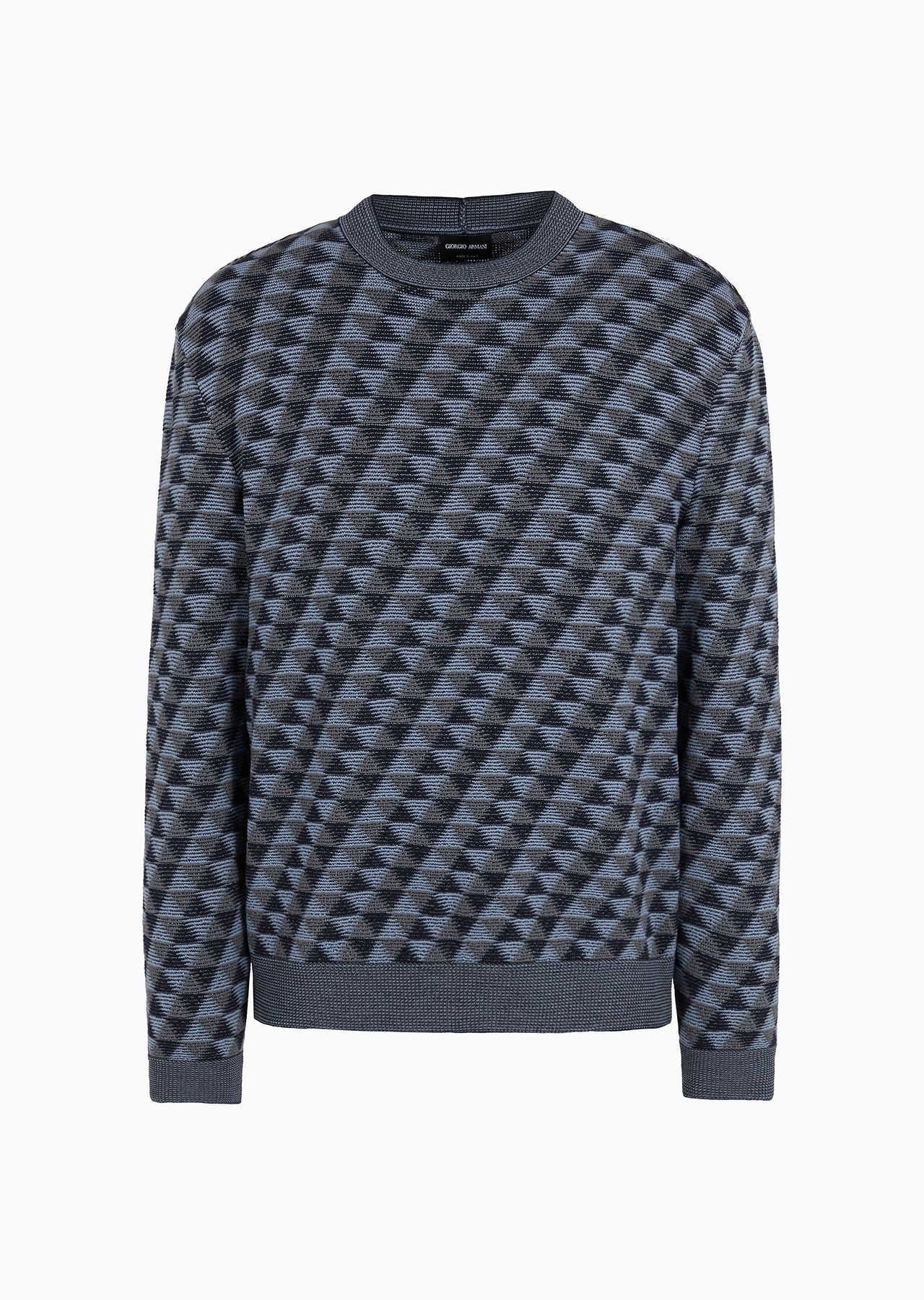 Cosy, comfortable crew-neck jumper made of virgin wool in the collection’s signature hues. The style features a distinctive jacquard with a three-colour geometric motif, embellished by a multi-striped detail on the collar, cuffs and hem. A piece designed for daytime outfits when worn with the collection’s trousers and jackets. Product Code: GM000411AF123731FB064 Details Composition 100% Virgin Wool Fineness: 14 Crew neck Long sleeves Three-colour jacquard with geometric motif 1x1 flat rib-knit edges with a narrow striped motif Made in Italy Fitting The model is 188 cm tall and is wearing size 48 / M