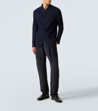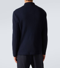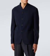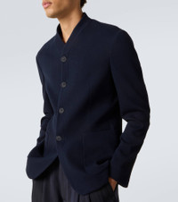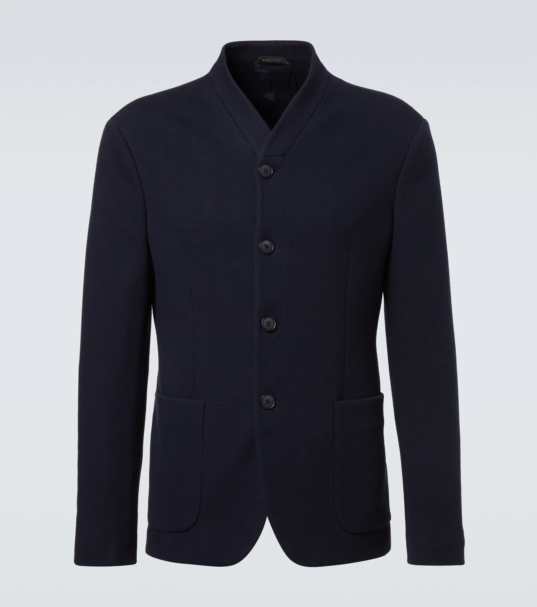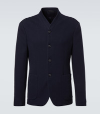 Made from a soft cotton and wool-blend jersey, this Giorgio Armani jacket features a form-fitting silhouette, a buttoned front, and large patch pockets. Product Details - Material: 45% wool, 45% cotton, 9% polyamide, 1% elastane - Care instructions: dry clean - Made in Italy - Designer color name: Dark Navy - Item color: blue - Lining: 94% cupro, 6% elastane - Closure: buttoned front - Pockets: patch pockets, internal pockets - Item number: P01047857 Size & Fit - True to size - For a looser fit, we recommend taking one size up - Slim fit - Non-stretchy fabric - Falls to the hip - Height of model is 188cm-74" and wears a size IT 50