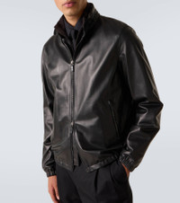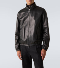 Known for its streamlined modernity, Giorgio Armani presents an elegant take on classic silhouettes and immaculate suiting. Crafted from supple leather, this sleek jacket features a high collar with two-way zipped front closure. Product Details - Material: 100% lamb leather - Care instructions: specialist clean - Made in Italy - Designer color name: Black - Item color: black - Lining: 100% polyester - Sleeve lining: 57% viscose, 43% polyester - Hood: 100% polyester - Hardware color: silver - Closure: two-way zipped front - Concealed hood - Cuff: elasticated - Pockets: zipped pockets - Hem: elasticated - Item number: P01106588 Size & Fit - Fits small to size - we recommend trying one size larger - Straight fit - Elasticated hem - Non-stretchy fabric - Falls to the hip - The model in the picture is 185cm-6'1" and wearing a size IT 52