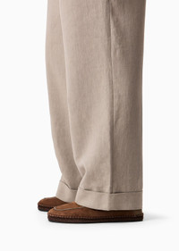 These pleated trousers in a modern, wide fit, embody the spirit of the season. Made from linen canvas, this style is distinguished by the special ribbed finish of the fabric that adds refined colour to the yarn. The belt loops at the waist with a waistband, in-seam pockets on the sides and double-welt back pockets with a button complete the piece. Product Code: 3WGPP0YNT02K61U6EQ Details Composition 100% Linen Double pleats Button and zip closure Two welt pockets Two back pockets with flap and button Cuff width: 26.5 cm Made in Italy Fitting The model is 188 cm tall and is wearing size 48/M