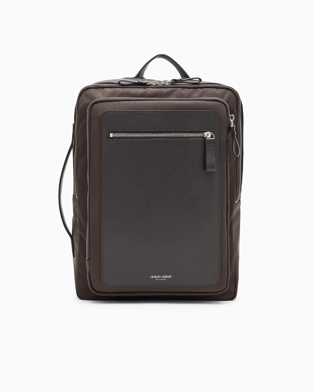 New briefcase backpack made of recycled nylon and pebbled leather, with compact yet capacious volumes, designed to take with you all day. Featuring two large compartments with zip closures, it has a laptop compartment and two comfortable padded shoulder straps that are detachable so that it can carried like a briefcase. A versatile, hard-wearing accessory with an urban attitude. Fabric: 50% recycled polyester Two zipped compartments One laptop pocket Outer pocket with zip fastening Pebbled-leather front insert Pebbled-leather handle Adjustable, padded shoulder straps that can be removed for carrying by hand Embossed Giorgio Armani logo Measurements: 30 x 42 x 14 cm Product Code: Y2O184Y752EU6031