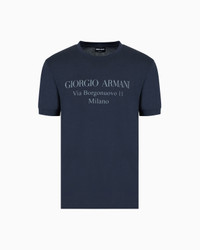 A symbol of casualwear, here the T-shirt is transformed into an exclusive, refined garment. Made from smooth cotton jersey, this style is embellished with the brand’s exclusive street address. Product Code: 3GST57SJMCZ1UBWF Details Composition 100% Cotton Crew neck Short sleeves Rolled, seamless collar and cuffs Contrasting water-print logo on the chest Made in Italy Fitting The model is 188 cm tall and is wearing size 48 / M
