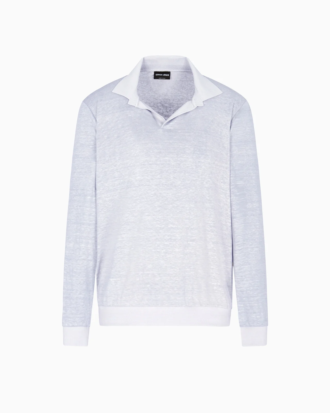 A laid back, modern attitude for this long-sleeved polo shirt made from linen jersey with a comfortable, lightweight feel. The clean, streamlined design features a buttonless open collar, and is finished with a matching-tone viscose-knit trim. A piece designed to complete informal looks when worn with the collection’s trousers and bermuda shorts. <br>The piece is part of the Holiday selection that plays with a striking colour palette, incorporating black onyx, sky blue and ivory. These shades are combined with luxurious fabrics like linen and silk, and iconic ones, like cupro and Lyocell, creating a unique experience in texture. Modern, relaxed shapes dress up different occasions with unmistakable Giorgio Armani style. Open polo-shirt collar Long sleeves Matching viscose knit collar, cuffs and hem Made in Italy Product Code: GM001995TE11335U1013