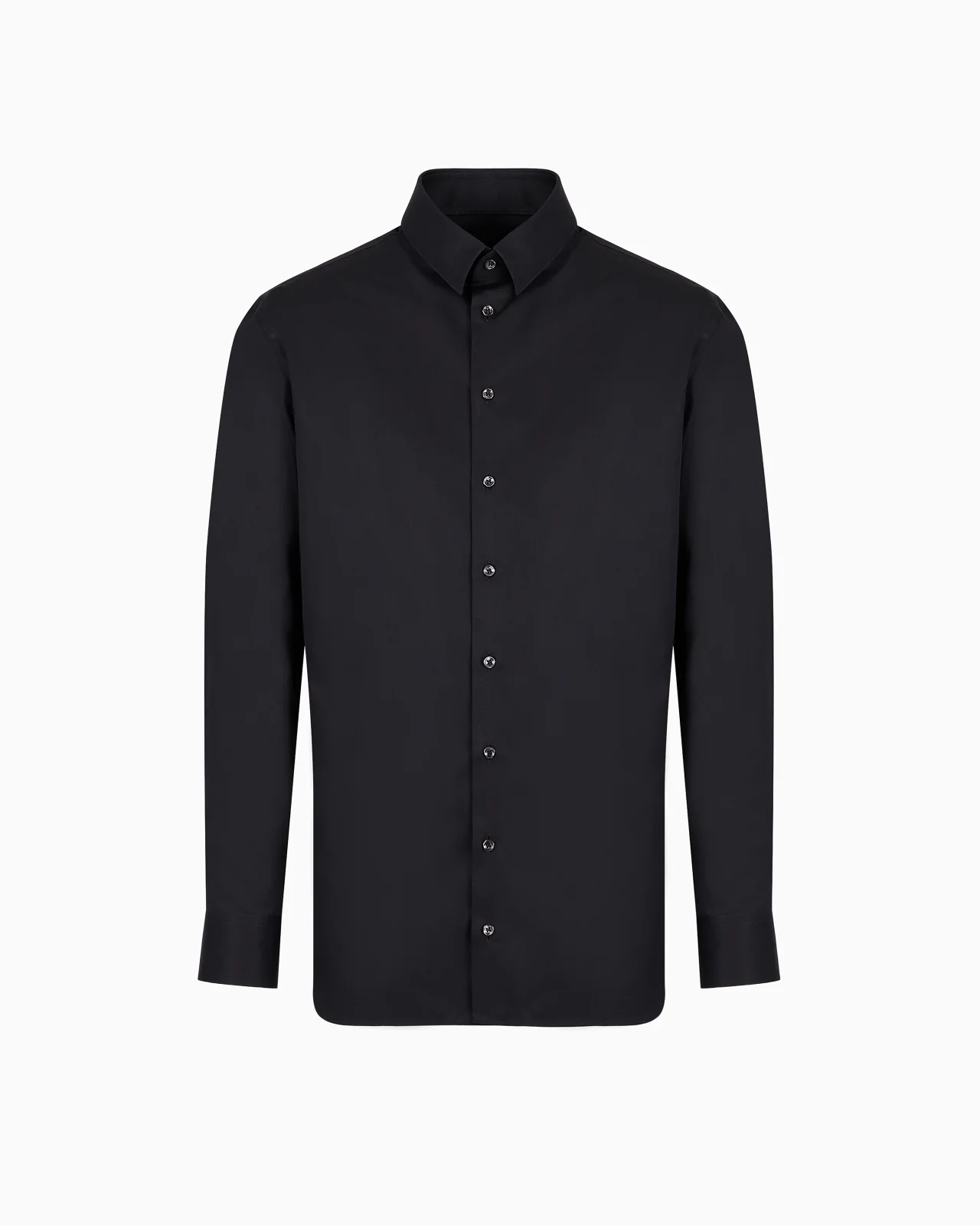 A regular-fit shirt in luxurious cotton twill with a smooth, silky feel. It features a back yoke, mother-of-pearl buttons and small collar with concealed press studs. Product Code: 8WGCCZMHTZ0691UC99 Details Composition 100% Cotton Regular fit Small high stand collar with concealed metal snap buttons Back yoke Tailored side hemline Shirt-fabric collar-stay pocket Fastened with mother of pearl buttons Made in Italy Fitting The model is 188 cm tall and is wearing size 40