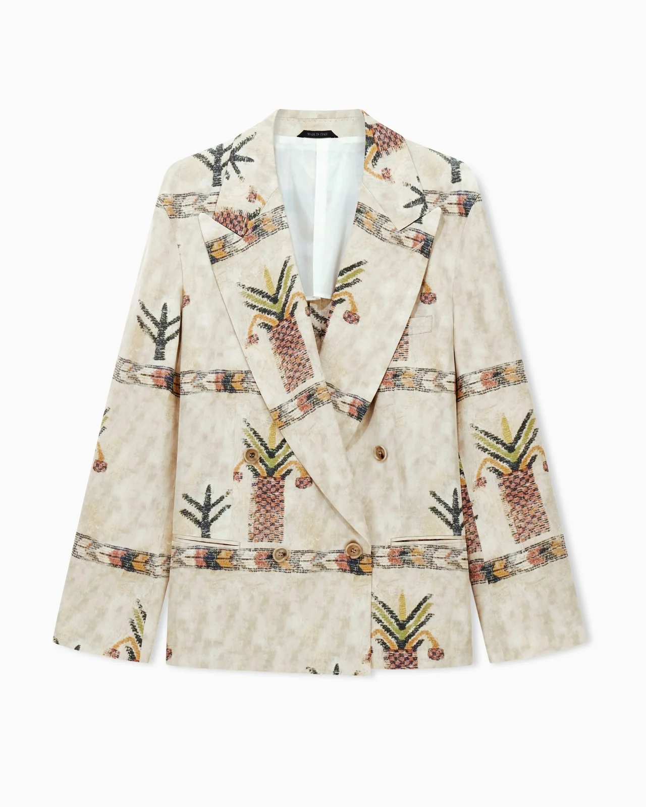 Double-breasted jacket with peak lapels, made of Lyocell and silk, enlivened by the all-over collection print. The garment features a two-button front fastening, a breast pocket and two side welt pockets. It lends itself to completing multiple looks when paired with the matching trousers for a sophisticated total look. Peak lapels Double-breasted, two-button closure Two front welt pockets Breast welt pocket Lined yoke Length: 70 cm Made in Italy Product Code: GM003523TE20760F1186