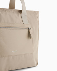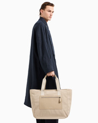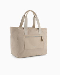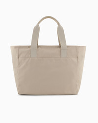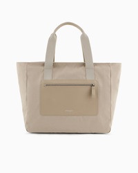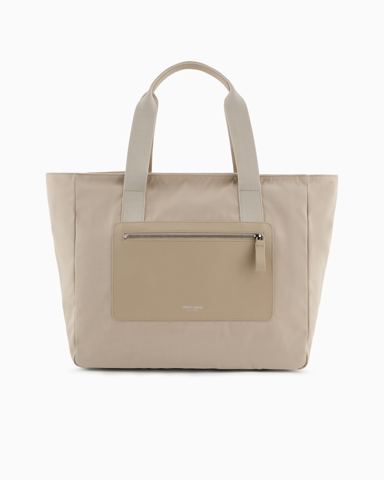 Shopper bag with spacious volumes that combines form and function, designed to fit different needs. This style is created in nylon made from certified recycled material and is embellished with a front zip pocket made of matching pebbled leather. A versatile offering, with a spacious and well-organised interior. Double handles in webbing Zip closure Zipped front pocket in pebbled leather Heat-stamped Giorgio Armani logo Inner pocket with zip Measurements: 46 x 20 x 36 cm Made in Italy Product Code: GM000826AF14204U6209