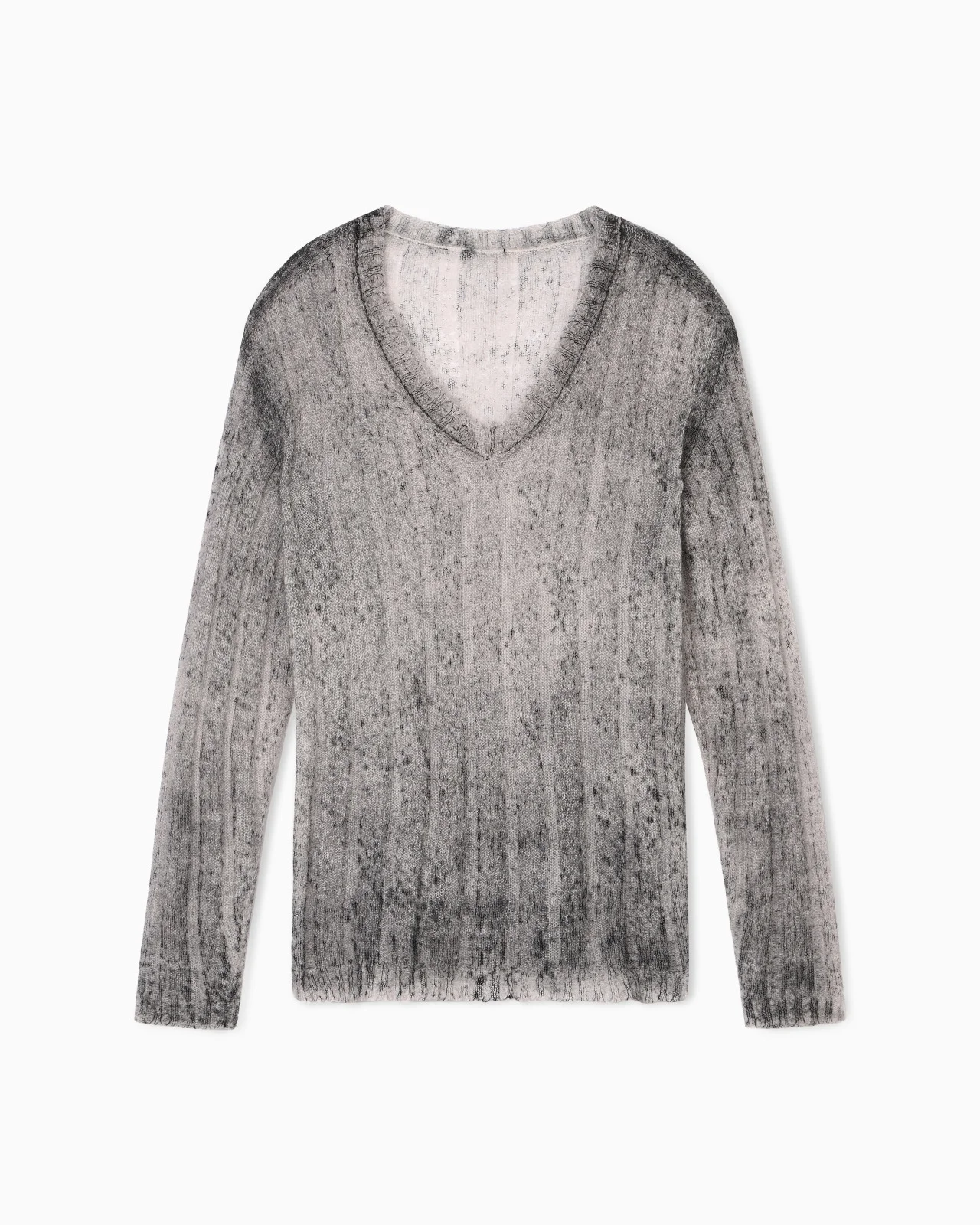 V-neck jumper made of cosy virgin wool yarn, distinguished by a rib-knit and contrasting print. The seamless construction of the piece makes it comfortable and extremely versatile and perfect for completing different looks teamed with the collection's trousers and shirts. Fineness: 10 Seamless V neck Long sleeves Contrasting, all-over print Made in Italy Product Code: GM002284AF20377U8110