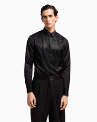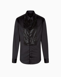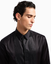 Tuxedo shirt made of exquisite cotton satin, featuring an elegant front plastron embellished with black rhinestones. The sheen of satin enhances the sophistication of the design, making it perfect for formal events. This style is part of the Giorgio’s collection: the Giorgio Armani selection inspired by the evening world. Clean lines, attention to detail, an elegant night-time colour palette and the choice of luxurious materials define this modern and essential selection, providing the look for an effortless evening wardrobe. Slim fit Wing-tip tuxedo collar with bow tie cover Plastron with matching rhinestones Back yoke Faced placket with mother-of-pearl buttons French seams Cuffs with mother-of-pearl buttons Made in Italy Product Code: GM002080TE15956UC001