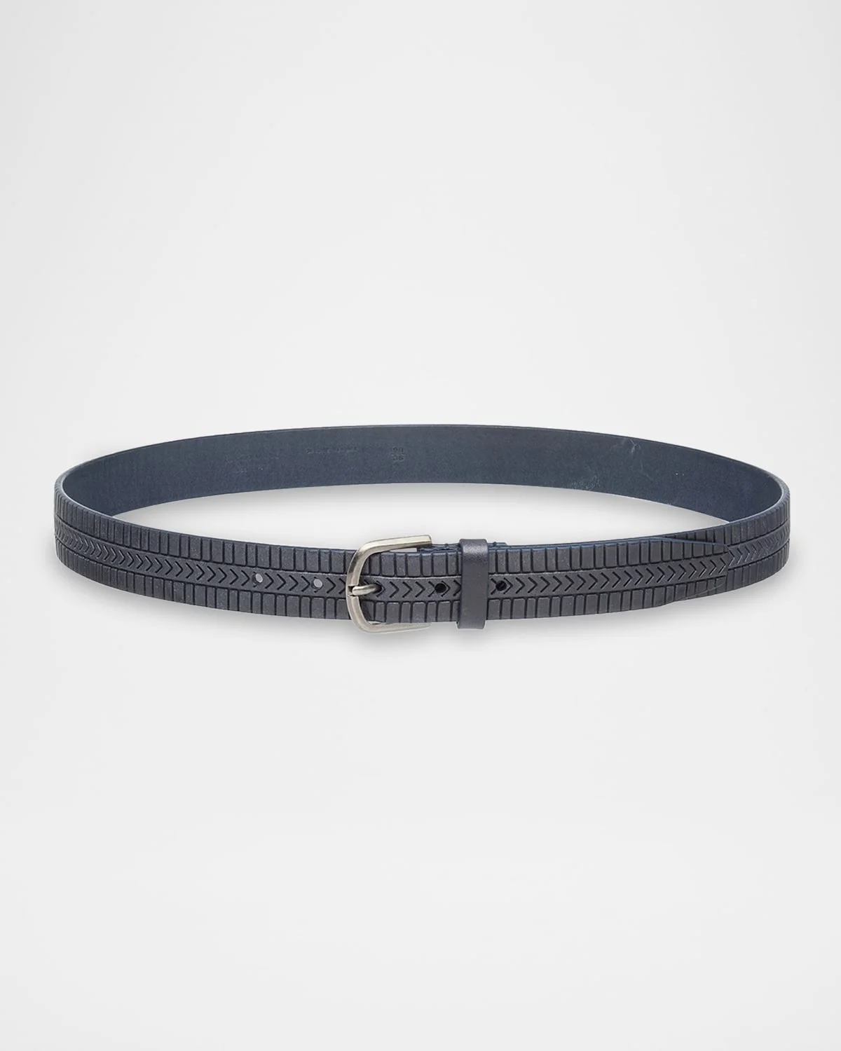 Giorgio Armani belt in textured calf leather defined by geometric engravings Approx. 1.2"W Pin buckle with an antique effect Leather loop Adjustable fit Leather Made in Italy