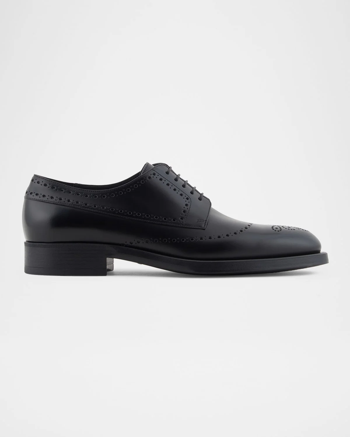 Giorgio Armani derby shoes in smooth leather accented with ornate brogue detailing Stacked heel Round toe Laceup vamp Rubber outsole Made in Italy