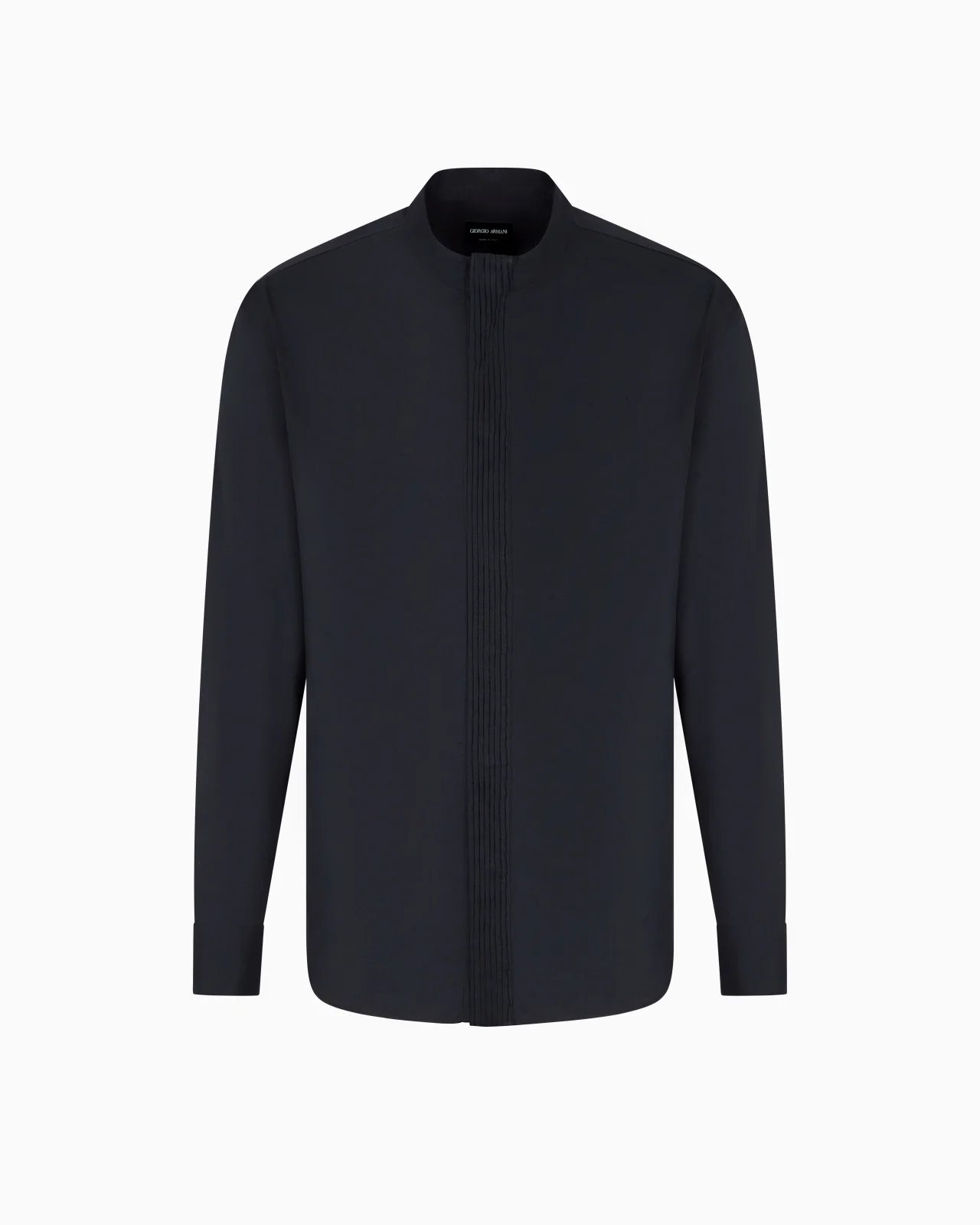 This regular-fit elegant shirt is made from luxury cotton twill. Defined by a guru collar, concealed buttoning and cuffs with a button and slit, a pleated motif on the placket adds distinction. An item that perfectly completes a wide array of looks. Regular fit Guru collar Invisible press-stud closure Pleated placket Cuffs with button and sleeve placket Back yoke Made in Italy Product Code: GM001403TE11189UC001