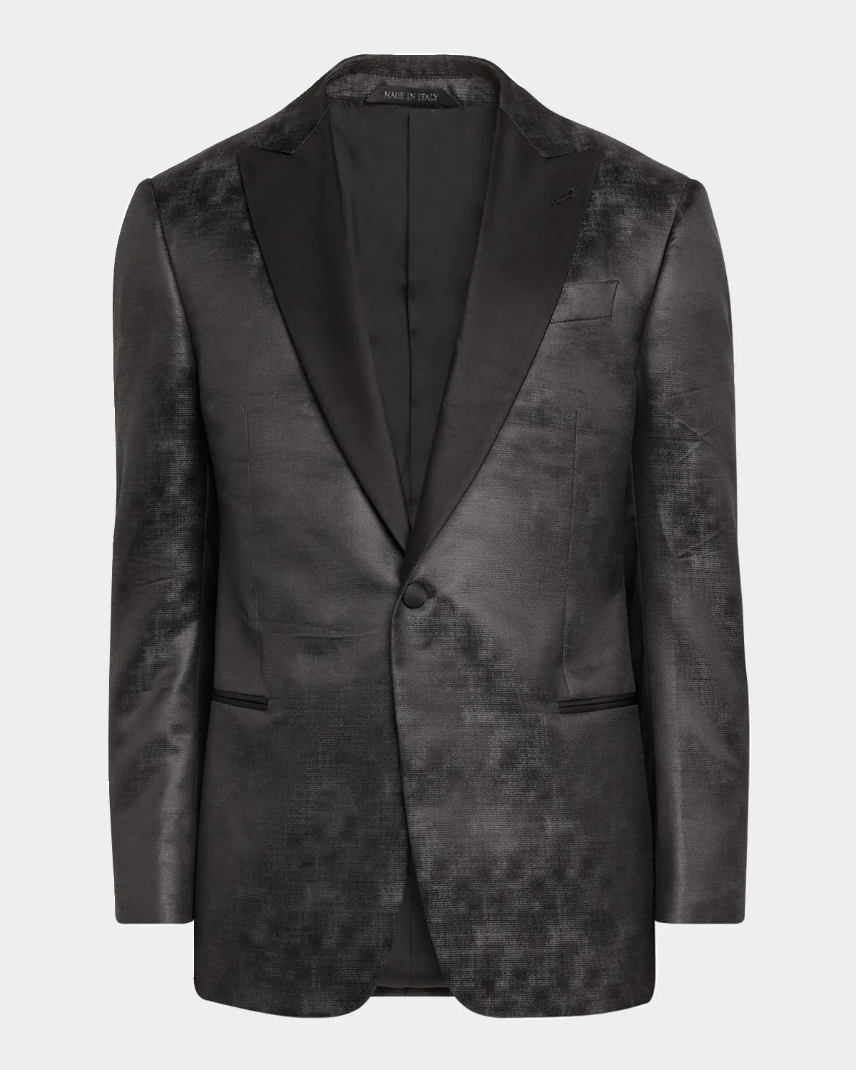 - Giorgio Armani dinner jacket in micro dot weave with washed effect - Peak lapels - Single-button closure - Chest welt pocket - Side besom pockets - Unfinished sleeves - Double-vented back - Wool/silk - Made in Italy - Model is 6'1"/185cm.