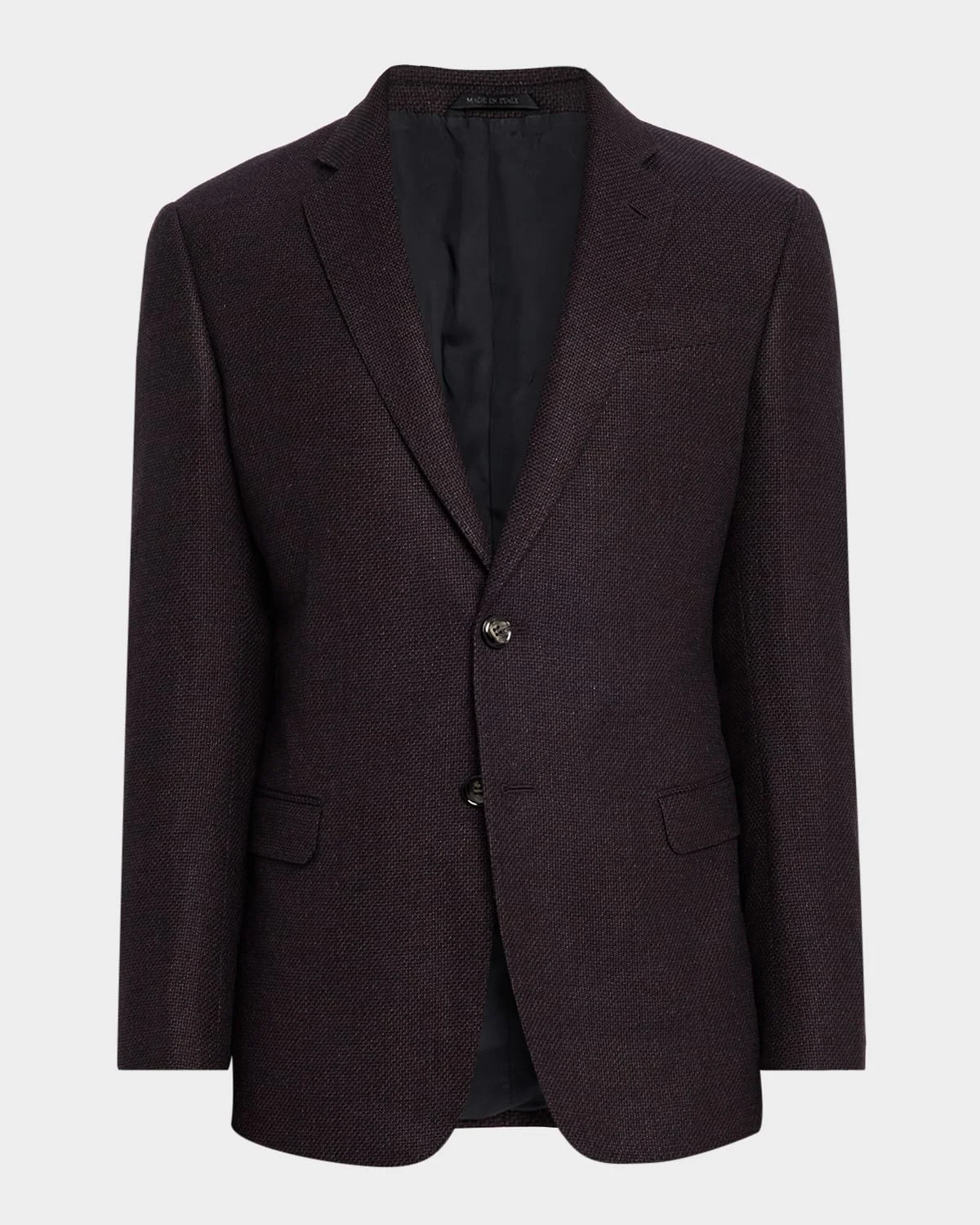 - A blend of wool, silk, and linen creates a microgrid texture for this Giorgio Armani sport coat. - Peak lapels - Two-button front - Chest welt pocket - Interior logo tag and pocket - Side flap pockets - Double-vented back - Virgin wool/silk/linen - Dry clean - Made in Italy