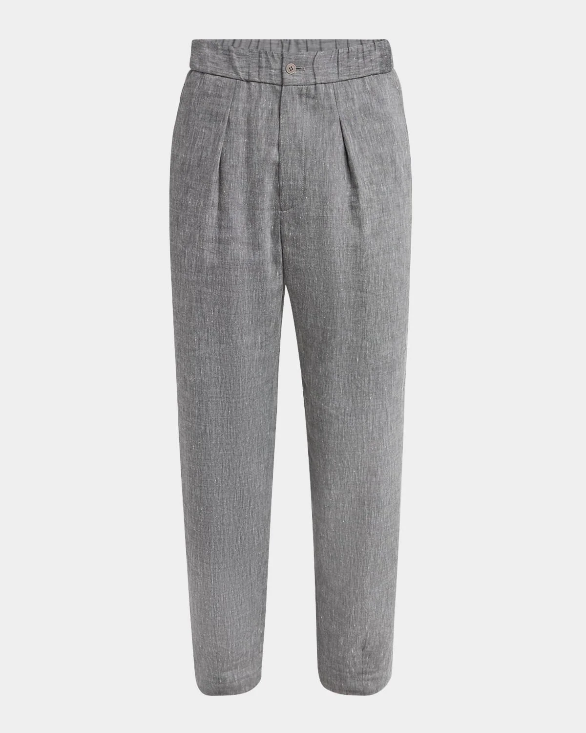 Giorgio Armani melange trousers Elasticized back waist Regular rise Button/zip closure Pleated front Side slip pockets Back welt pockets Full length Loose fit through straight legs Linen/virgin wool Dry clean Made in Italy